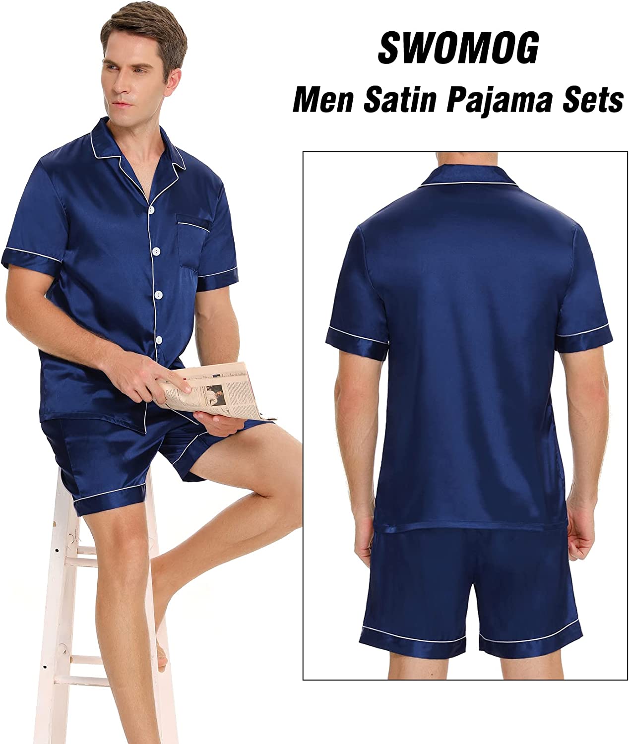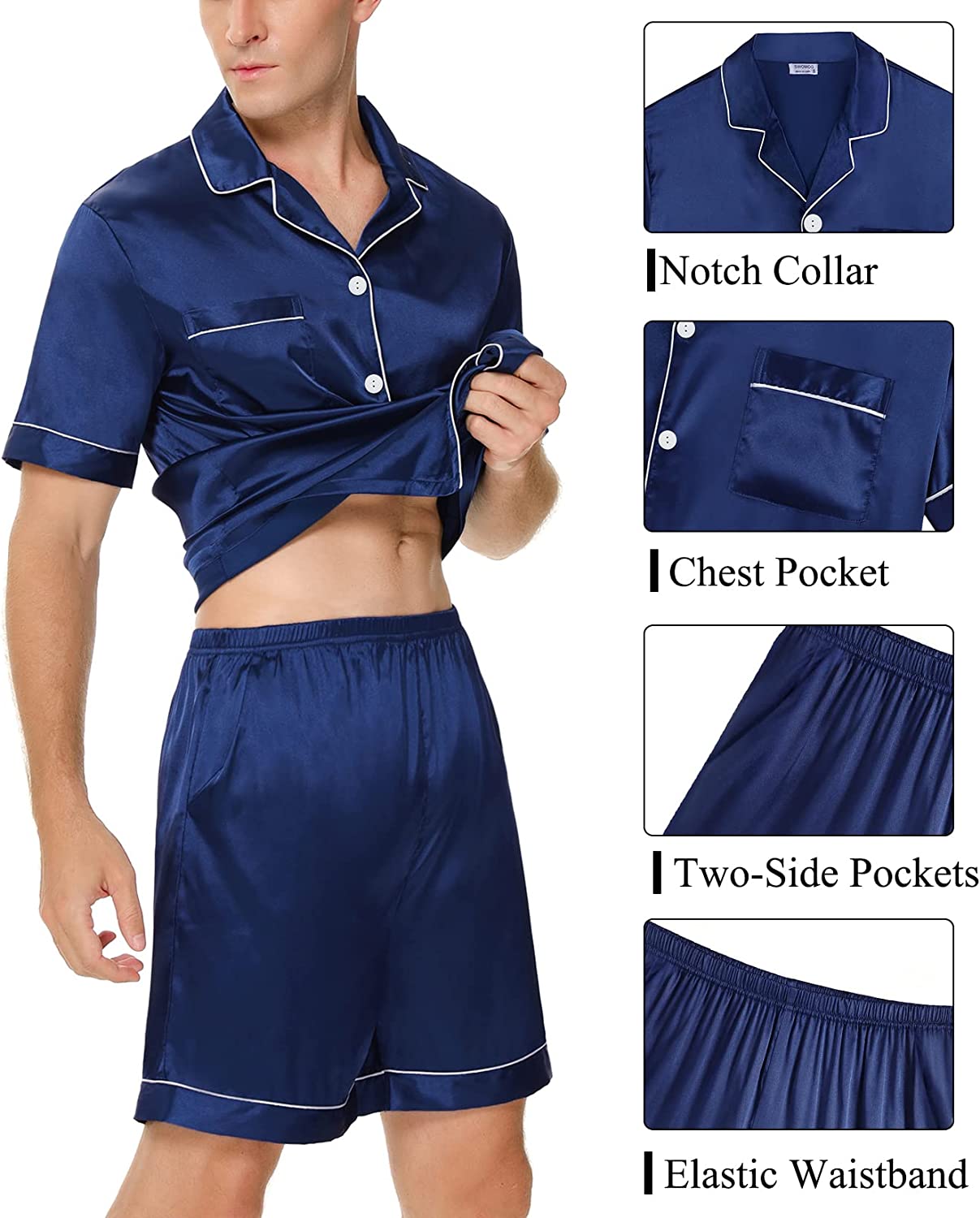 - FEATURES - Men satin 2 piece Pjs set with short sleeved button-down top and elastic waist pants, easy to put on and off. Classic notch collar, chest pocket lend sophisticated detail. Sleepwear with pockets to place your phone and wallet. Satin silk pajamas features contrast color, makes you more decorous.