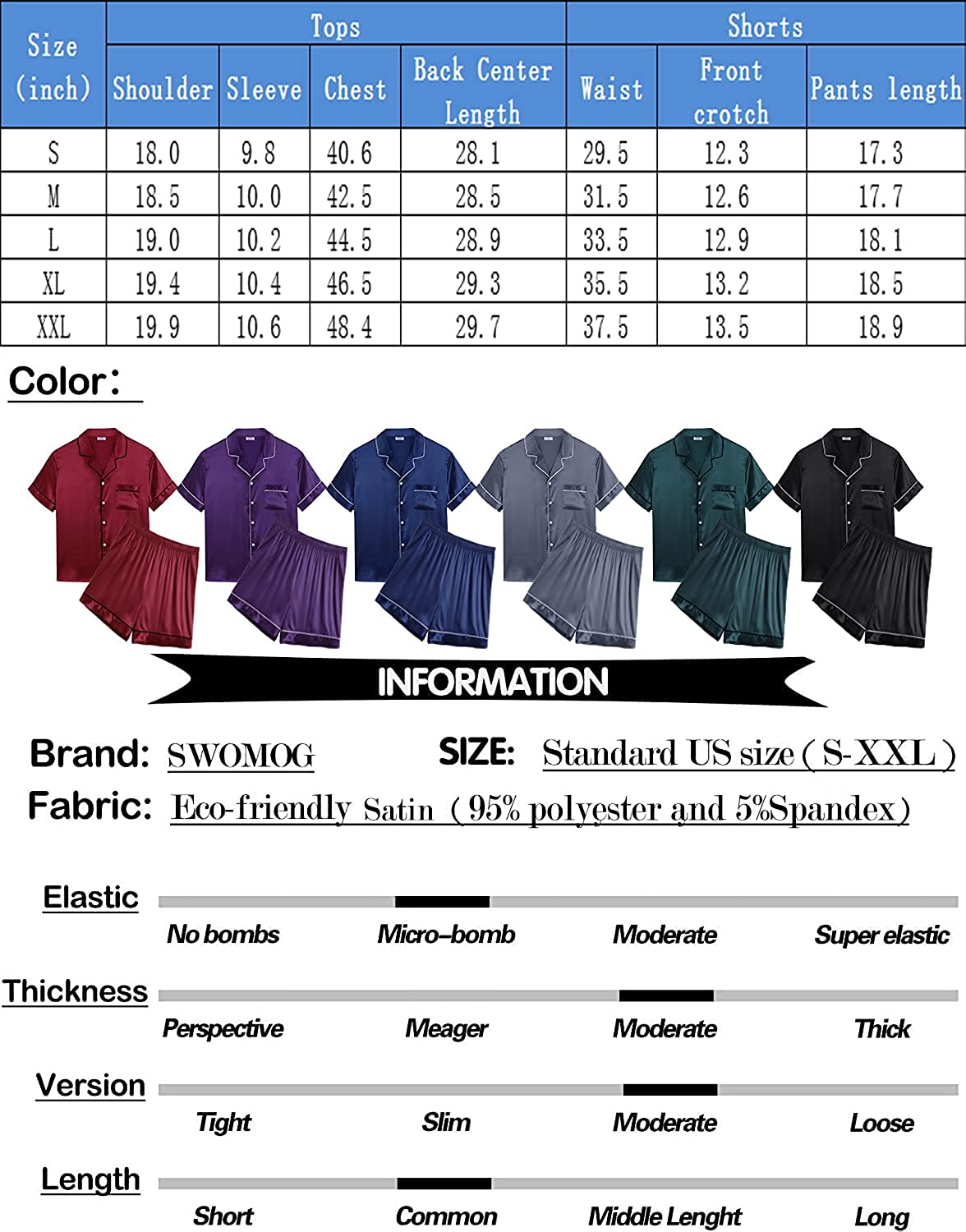 SWOMOG Mens Satin Pajamas Sets Size Chart