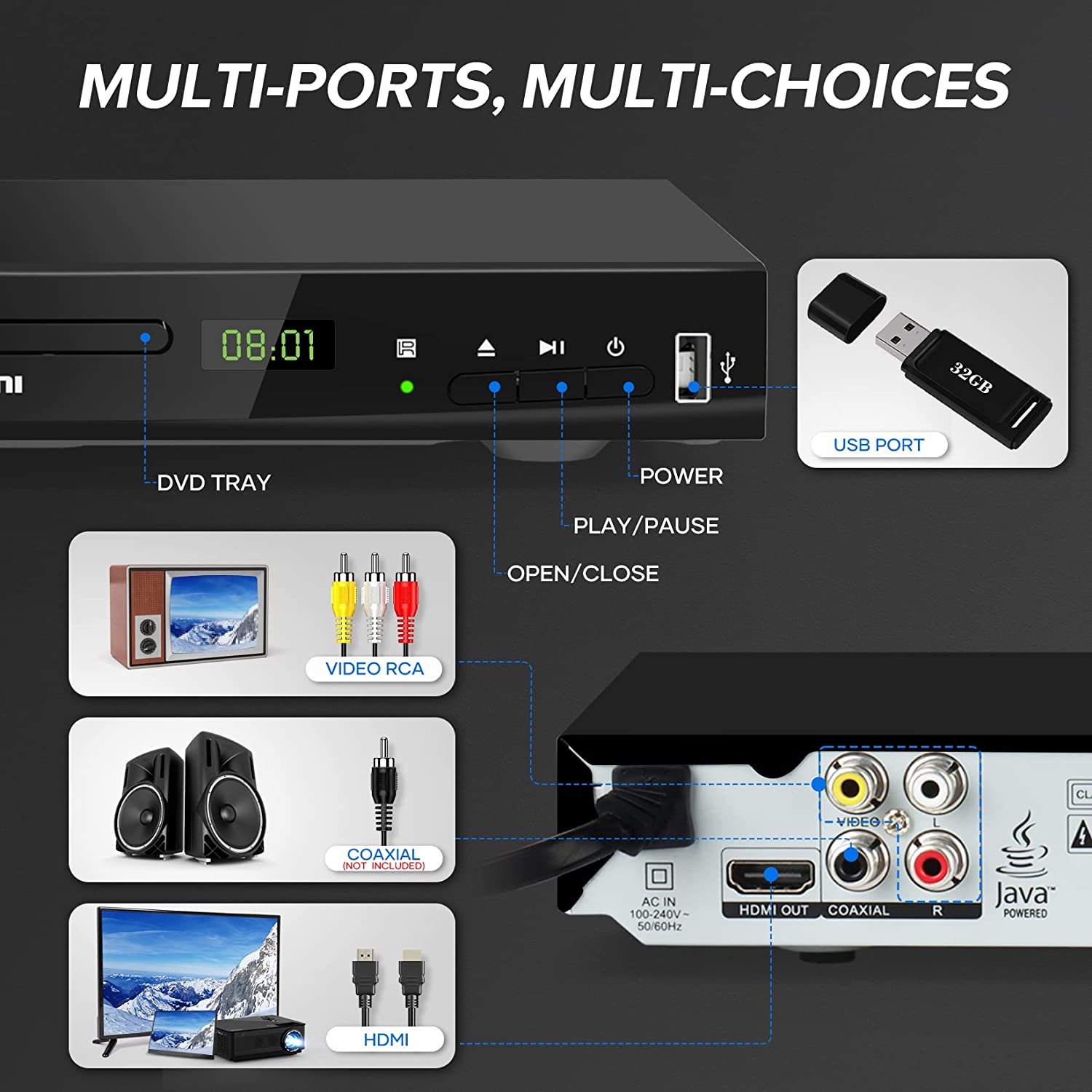 This DVD player not only got a compact and tiny body, but also equipped with various expanded ports like HDMI & RCA & COAXIAL output, super easy to connect to your home TV, projectors, monitors, or home audio systems. USB 2.0 Port support USB flash drives up to 32GB, so you enjoy the downloaded movies, music and pictures of your USB thumb