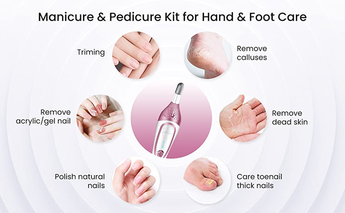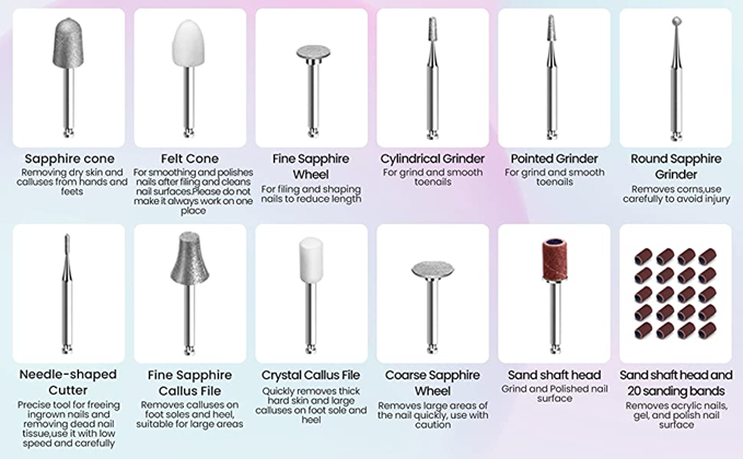 ★【 Multi function-11 Stainless Steel Bits】This manicure pedicure tools includes 11 high-quality stainless steel bits that are made from durable sapphire and felt as opposed to plastic and 20 sanding bands, which are used for easily grinding, filing, shaping, cutting, polishing nails, smoothing corns ,calluses, grinding thick nails and removing acrylics nails, gel polish,cuticles and treatment of hands & foot.