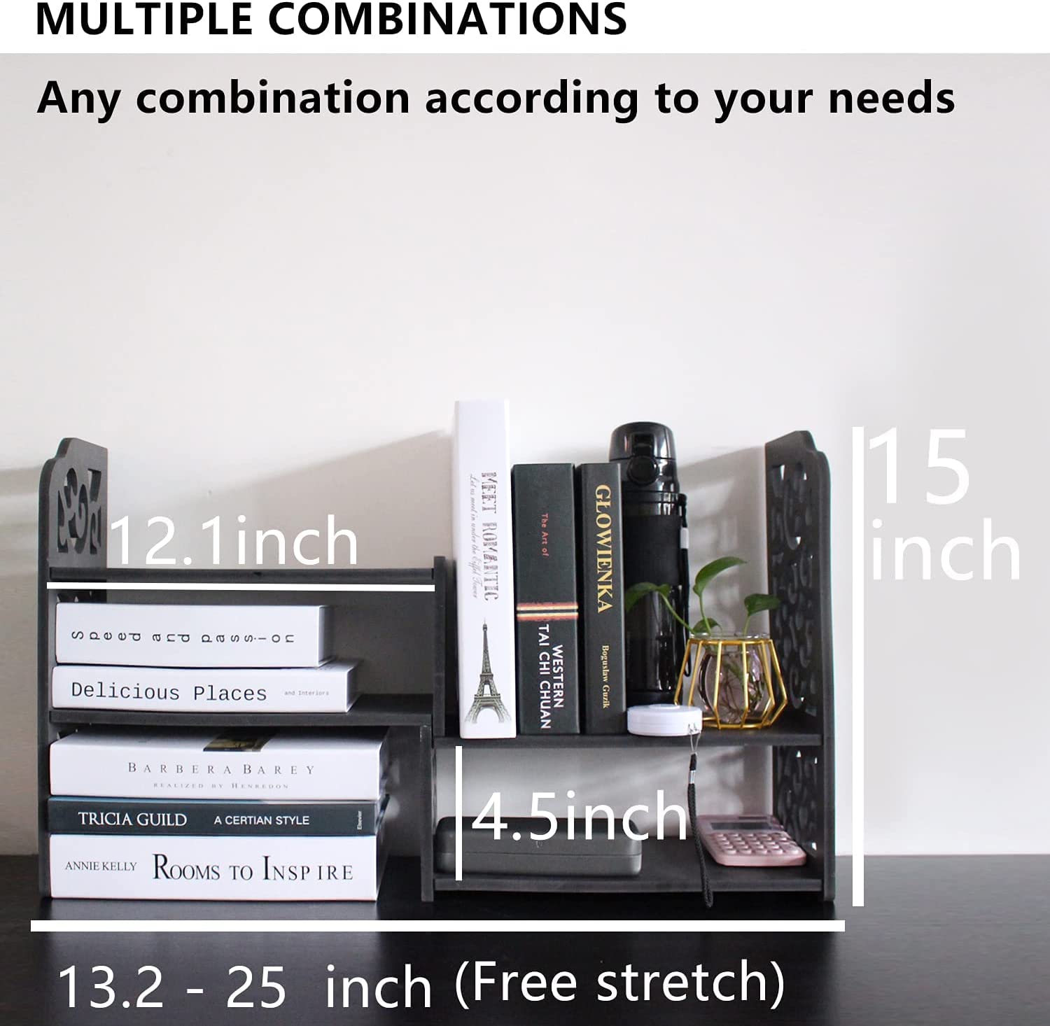 ?Perfect adjustable size:: Our small desktop bookshelf single size is 12.9 * 6.6 * 15 inches. The maximum length of the two shelves combined is 25.5 inches, and the middle compartment is 4.2 inches high. The size is moderate and can accommodate more article. This office storage shelf desk organizer is fully packaged and easy to transport. there is almost no damage during shipping, giving you a good shopping experience