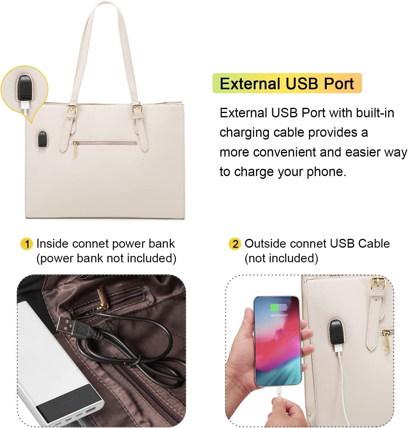 【Multi-pocket Design】Multiple pockets keep your belongings organized. The handbag structure consists of a 15.6-inch laptop pocket, an iPad pocket, a middle zipper pocket, an internal side zipper pocket, two large opening compartments, two small opening pockets, two pen pockets and an outer zipper pocket. And an external USB charging mouth.