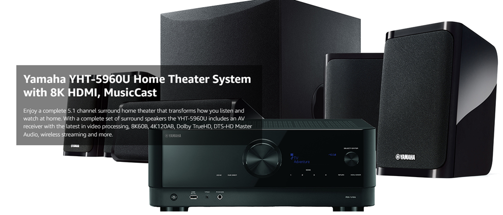 Enjoy a complete home theater with the YHT-5960U. This 5.1-channel surround sound system will transform how you listen and watch at home with a powerful subwoofer and complete set of surround speakers. The YHT-5960U home-theater-in-a-box includes an AV receiver with the latest in video processing, Dolby TrueHD, DTS-HD Master Audio, wireless streaming and more.