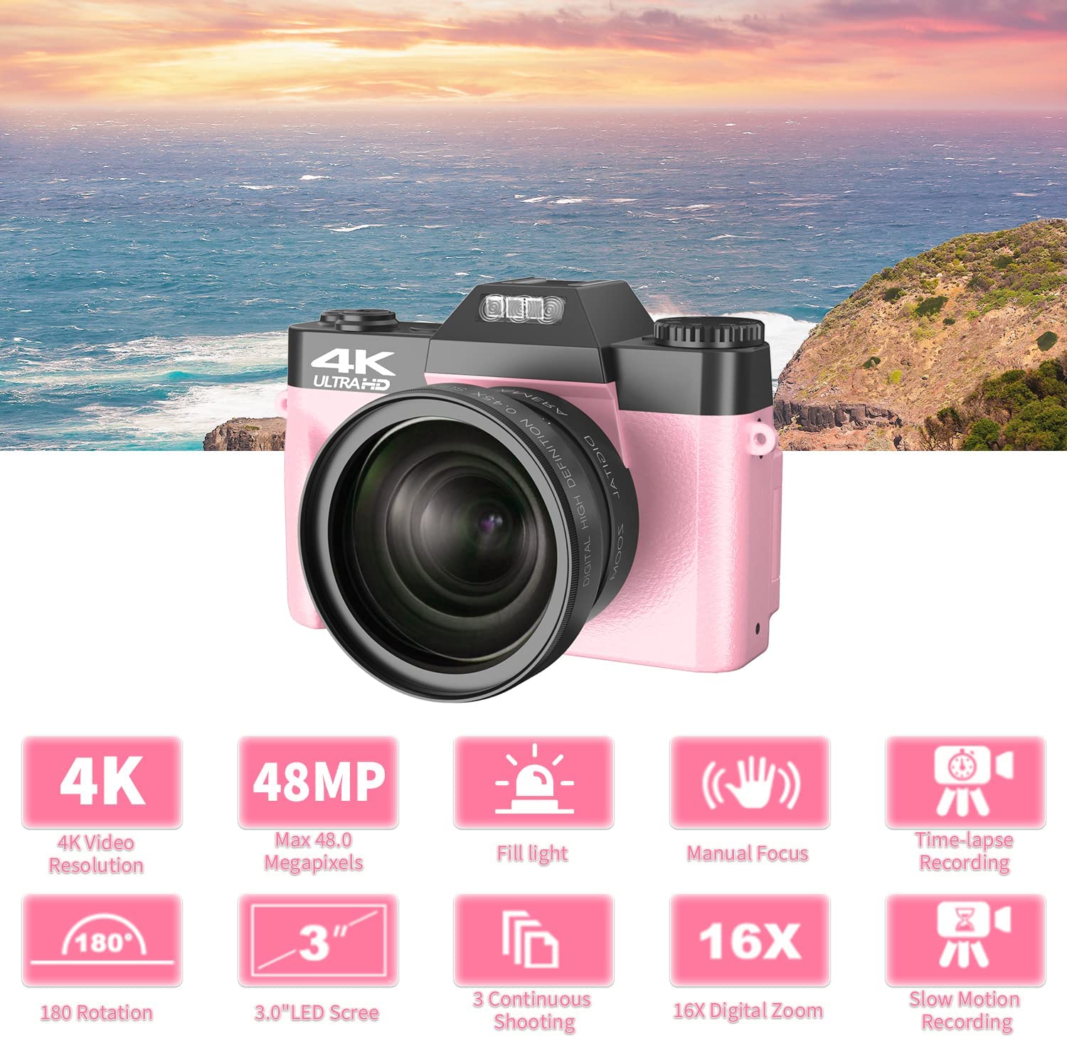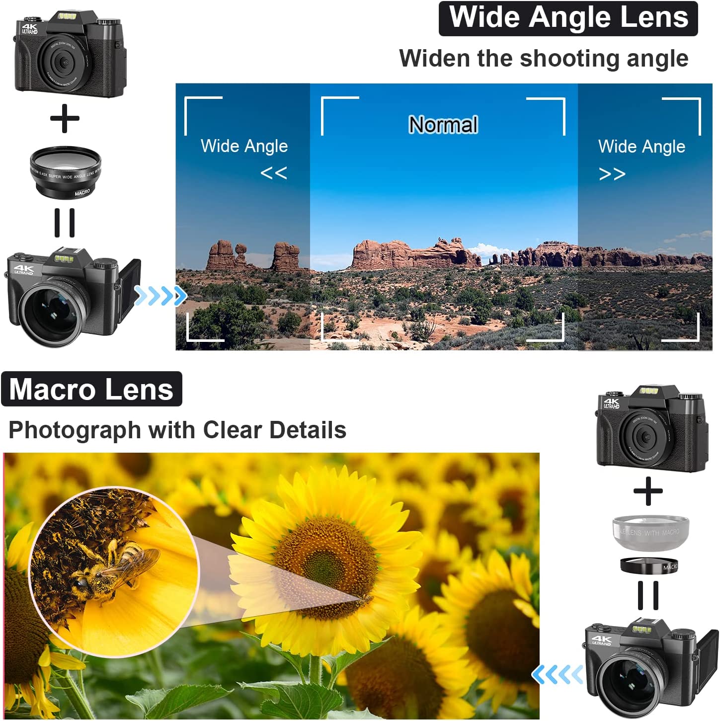 Digital Cameras for Photography, 4K 48MP Vlogging Camera 16X Digital Zoom Manual Focus Rechargeable Students Compact Camera with 52mm Wide-Angle Lens & Macro Lens, 32G Micro Card and 2 Batteries