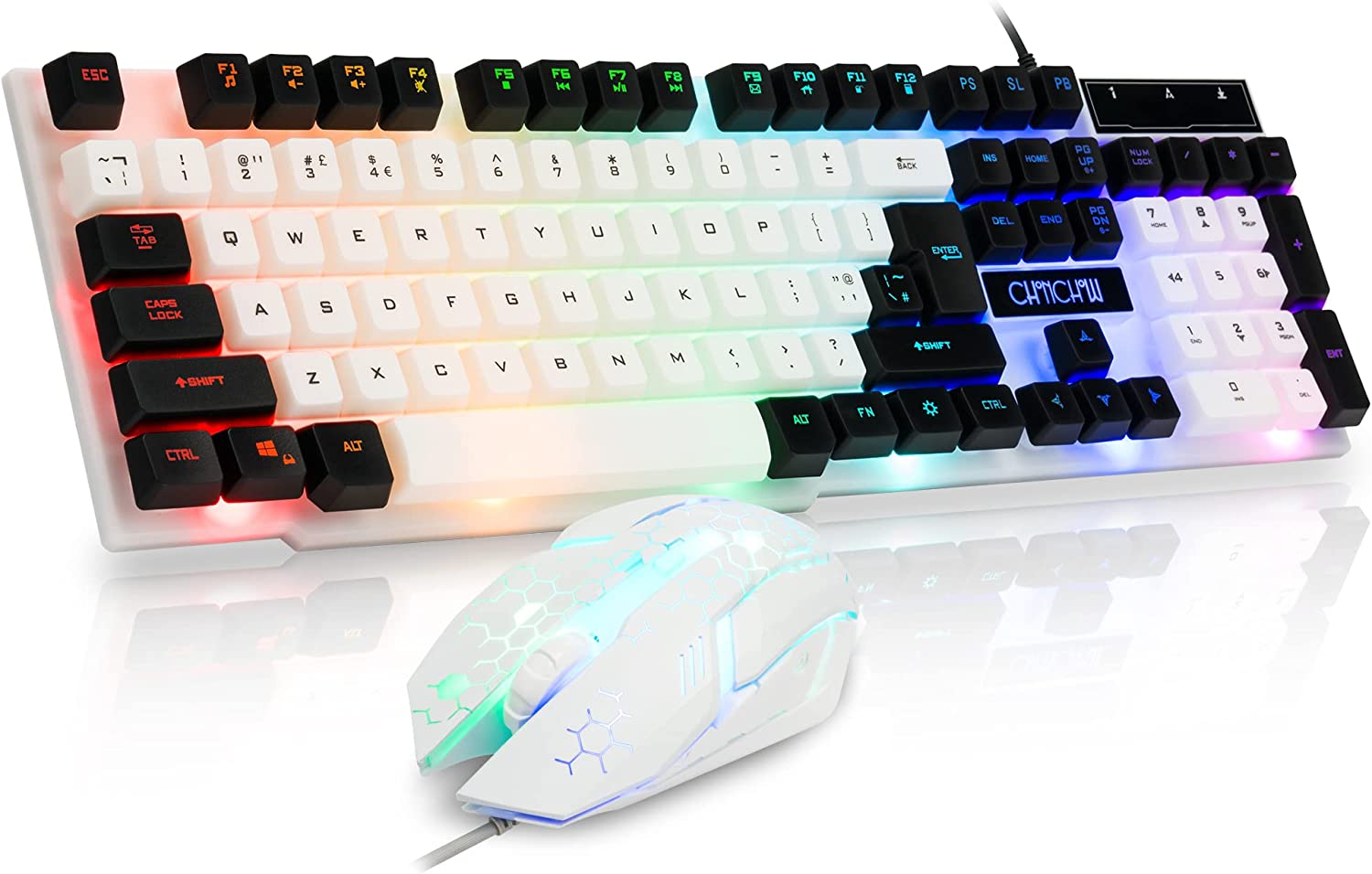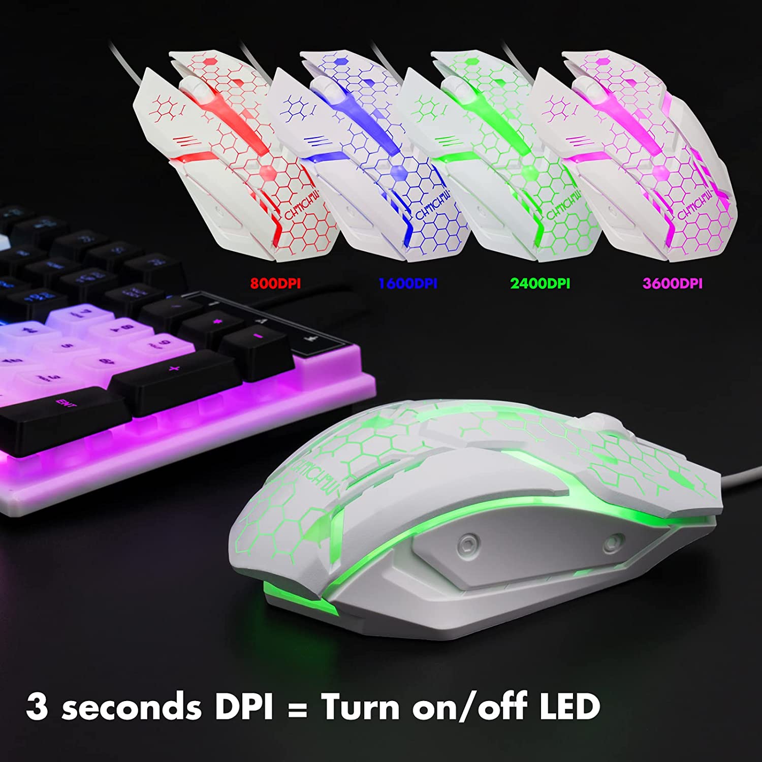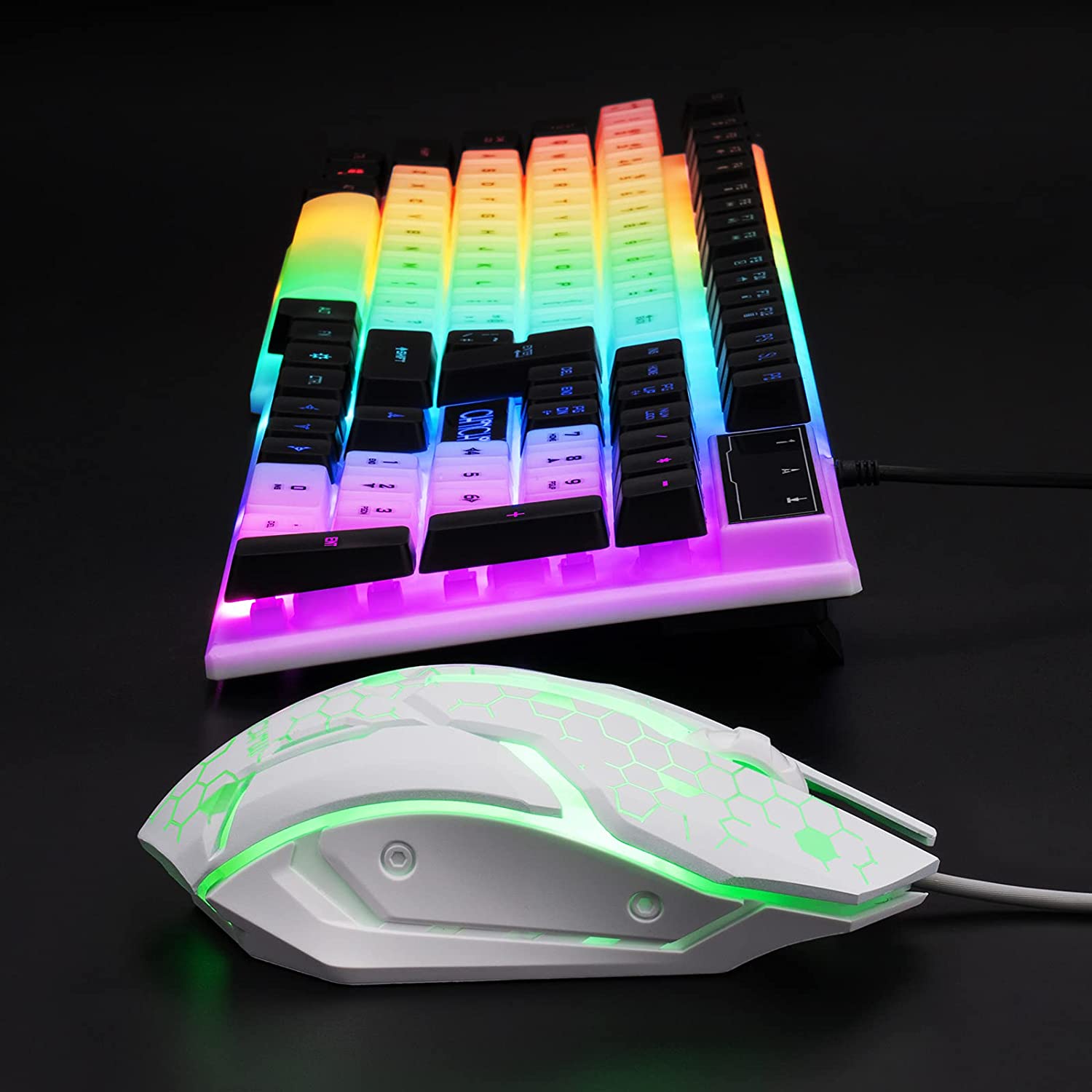 • 7 COLORS RAINBOW MOUSE AND KEYBOARD--rainbow backlit mechanical feeling keyboard have 2 backlit mode and adjustment of brightness,it can also turn on/off directly.Circle rgb mouse have 7 colors backlight and will turn off/on through the "3 seconds press to dpi".