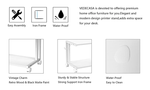 • 【STABLE STRUCTURE & DURABLE】We designed our printer stand with premium iron steel frame and thick wood partical wood which make the structure more stable, and it can easily hold up to 65lbs.