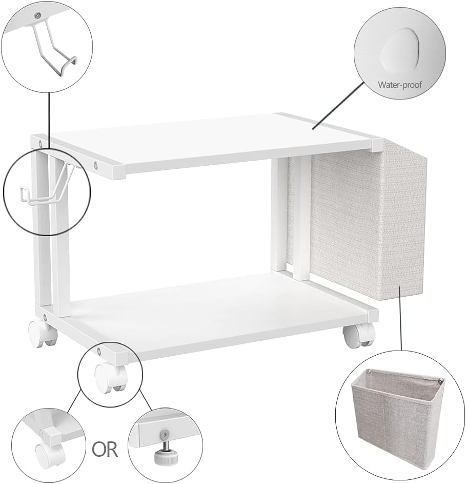 VEDECASA 2 Tier Modern White Wooden Under Desk Printer Stand with Storage Bag for Home Office Desktop Printer Table Organizer Mobile Printer Shelf Cart with Caster Wheel (White)