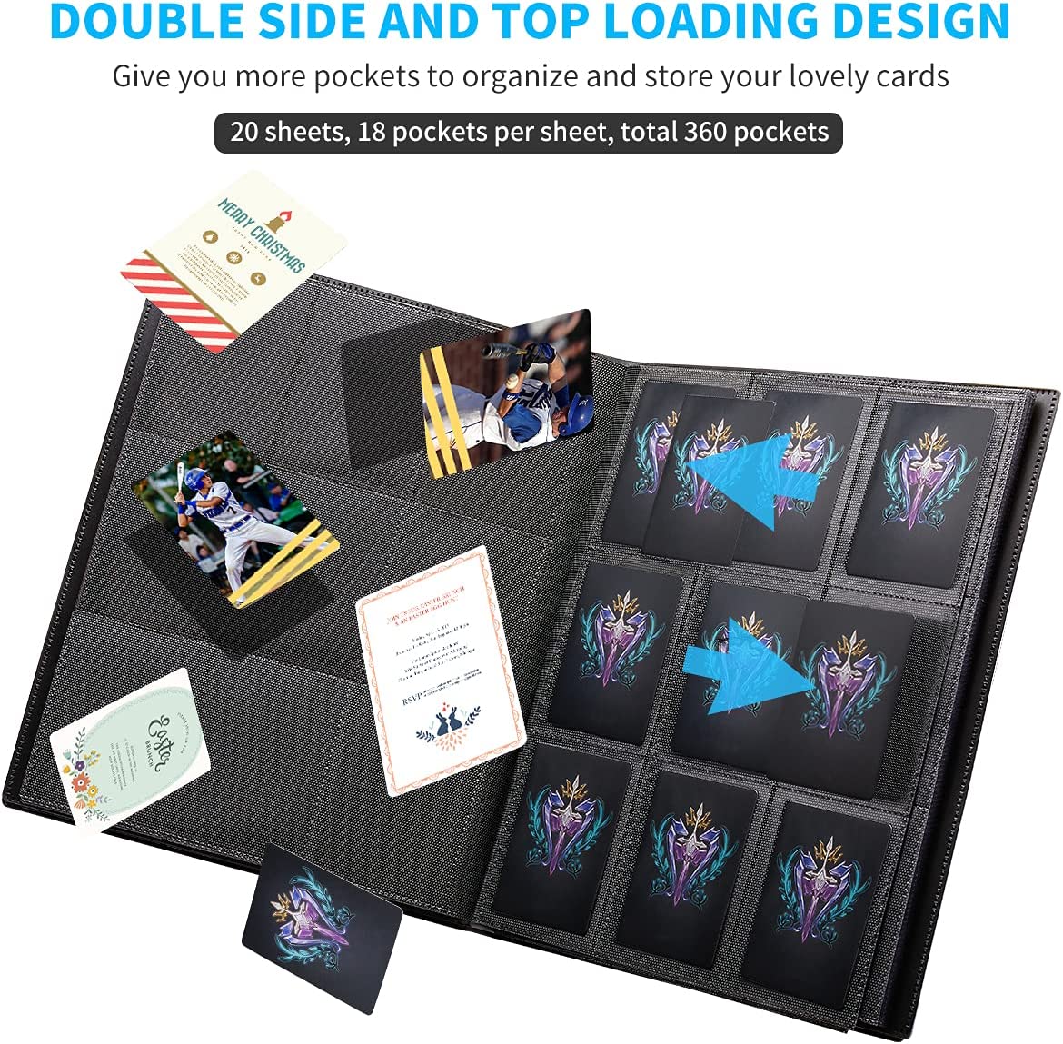 ❤️【DOUBLE SIDE AND OVERSIZED DESIGN】- 18 pockets per sheet (9 pockets per page), 24 sheets total 432 pockets give more pockets to organize and storage your card for one pokemon card binders holder. 2.7 x 3.8 inch extra larger size pockets fit the card with plenty of space for cards with sleeves, comfortably and transfer cards around when you need to re-organize