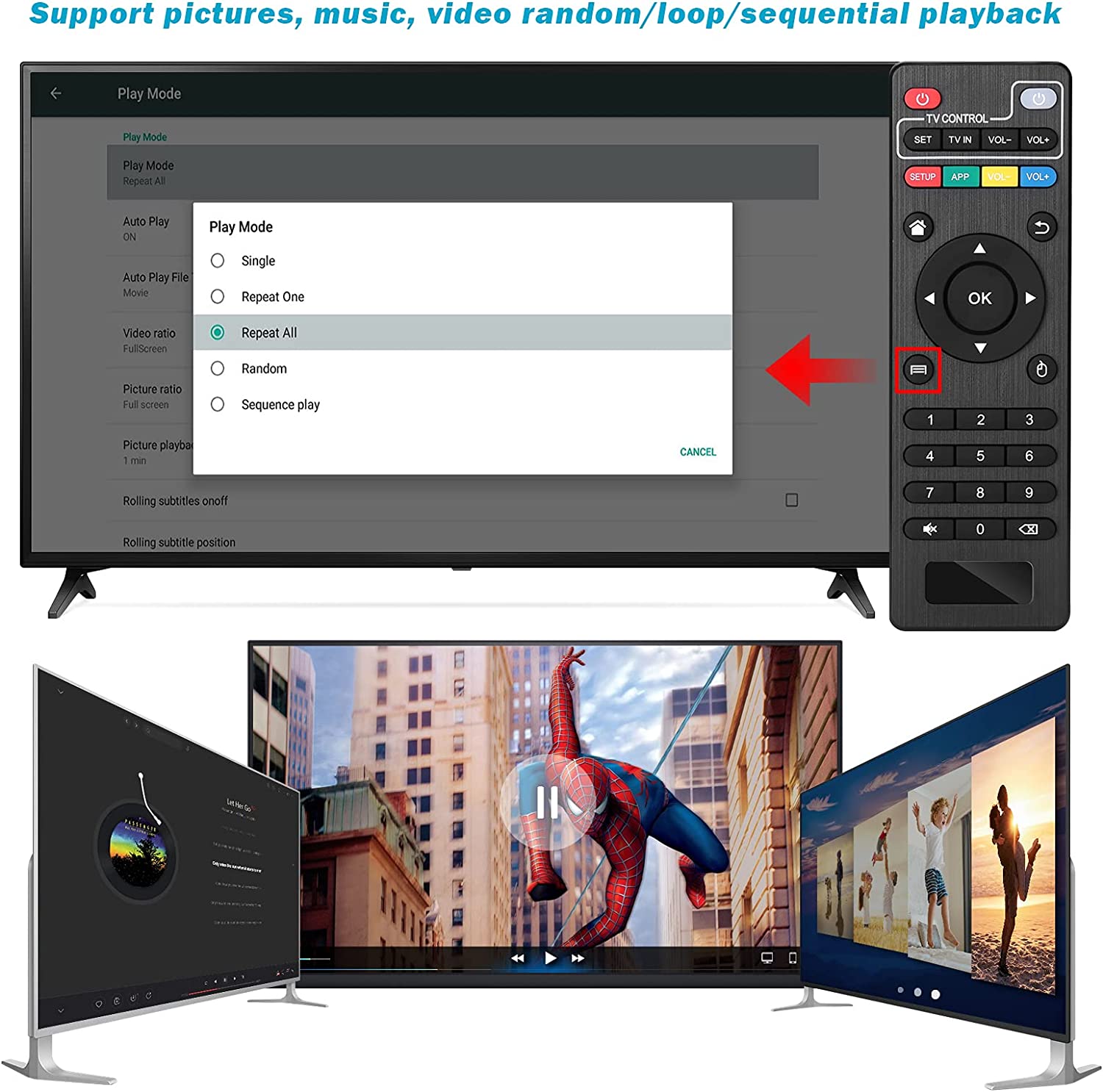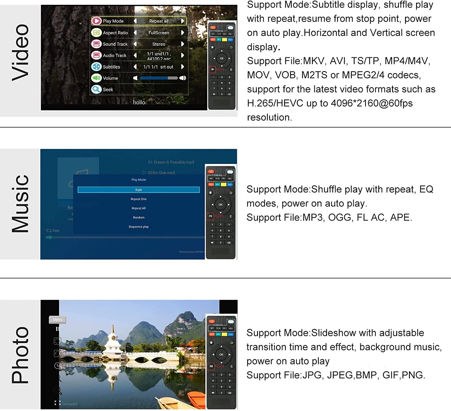 - 【Support Video/Picture/Music/PPT & Auto/loop mode playback】-- This 4k media player can play various popular videos, music, and photos. It has repeat playback,Automatic Playback and shuffles playback mode; It also reads PPT document. You can choose a variety of play mode: single, sequential. Especially for random playing video, music. Support video breakpoint and select mode from the beginning, you can start your home theater as you like. NOTE: NO random play for photos.