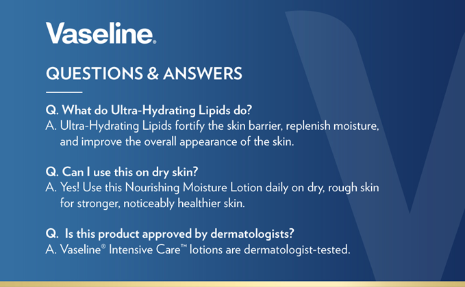 Vaseline Intensive Care Nourishing Moisture Lotion, with Ultra-Hydrating Lipids and Pure Oat Extract, moisturizes and nourishes for healthy-looking skin. This body moisturizer is clinically tested to provide 90% more skin moisture (vs. untreated skin).