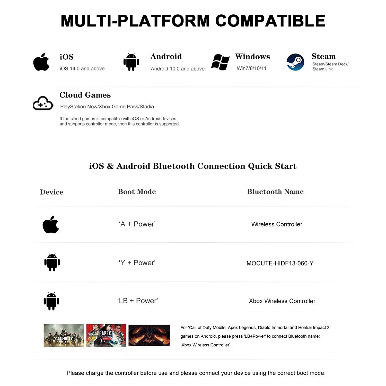 【Direct Play & Works with any Game that Supports Game Controllers】Bluetooth connection can be played directly, ultra-low latency. Our game controller works with any game that supports game controllers, like Call of Duty Mobile, Genshin Impact, Minecraft, Asphalt 9: Legends, Diablo Immortal, Sky: Children of Light, GTA: Liberty City Stories, Gangstar Vegas and more. If you are not sure our controllers are compatible with your game, you can ask a question or email us and we will get back to you within 24 hours.