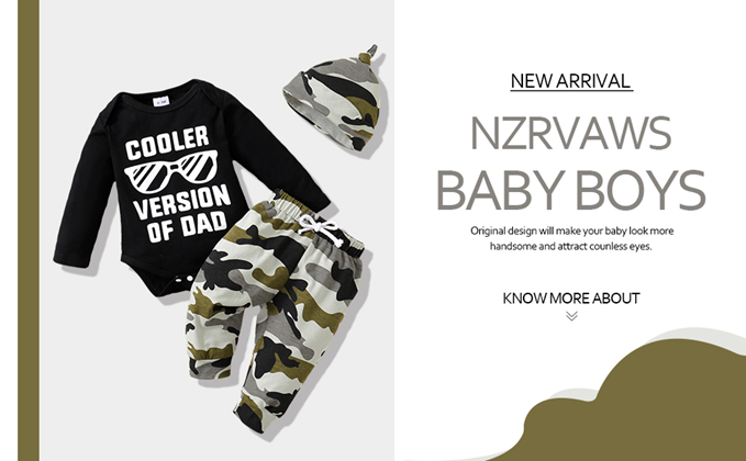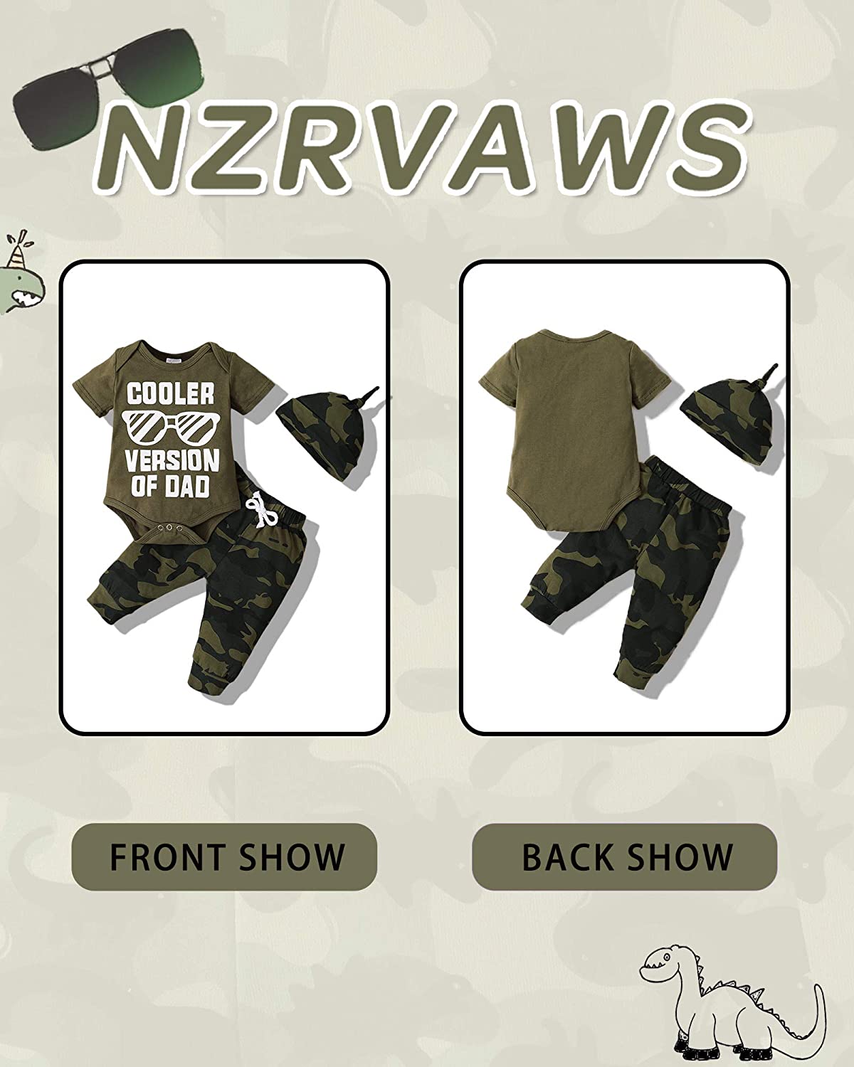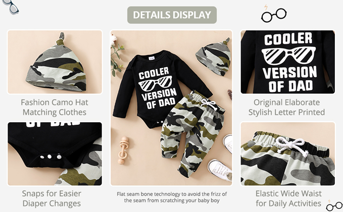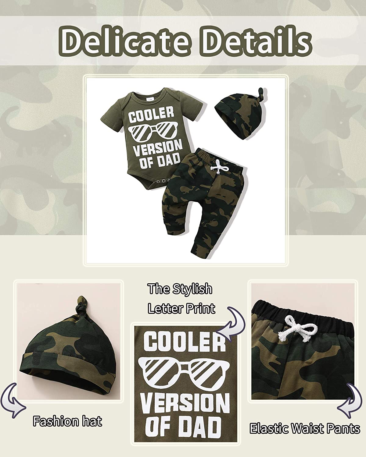 • √ Unique design of Baby Boy Outfit–Baby boy romper top with botton opening for easy wear . "COOLER VERSION OF DAD" printed stylish bring impressive and eye-catching feelings . Elastic waistband camo long pants make for easy dressing and bring convenience for movement.It also has a hat for your boy . Your boy will be the handsome one.