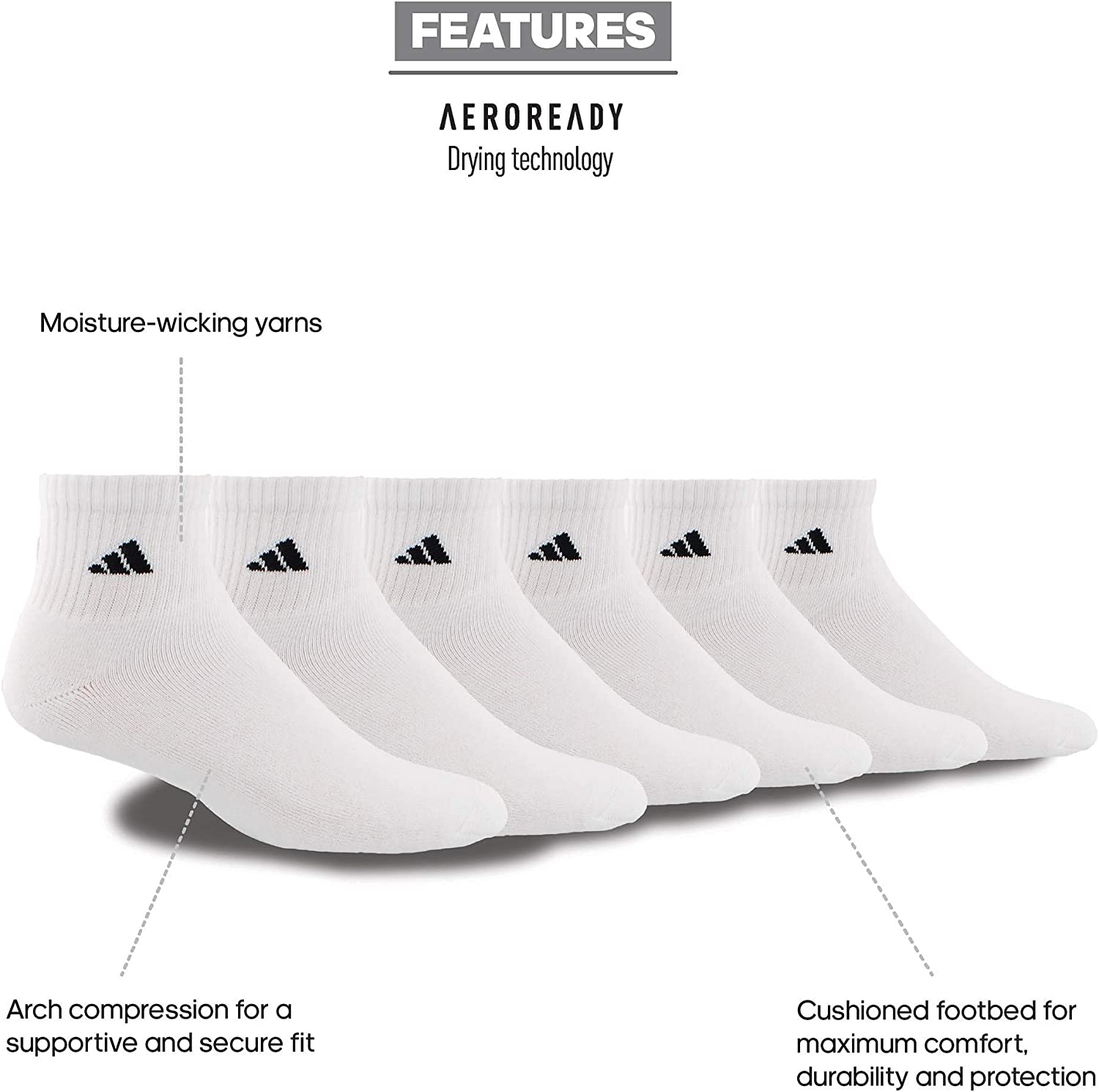 Quality, comfort, and durability is what you are looking for in your everyday sock and the adidas 6-pack delivers on all of your needs. now, with the addition of arch compression, this sock delivers a secure fit and gives you the best sock to handle your day to day.