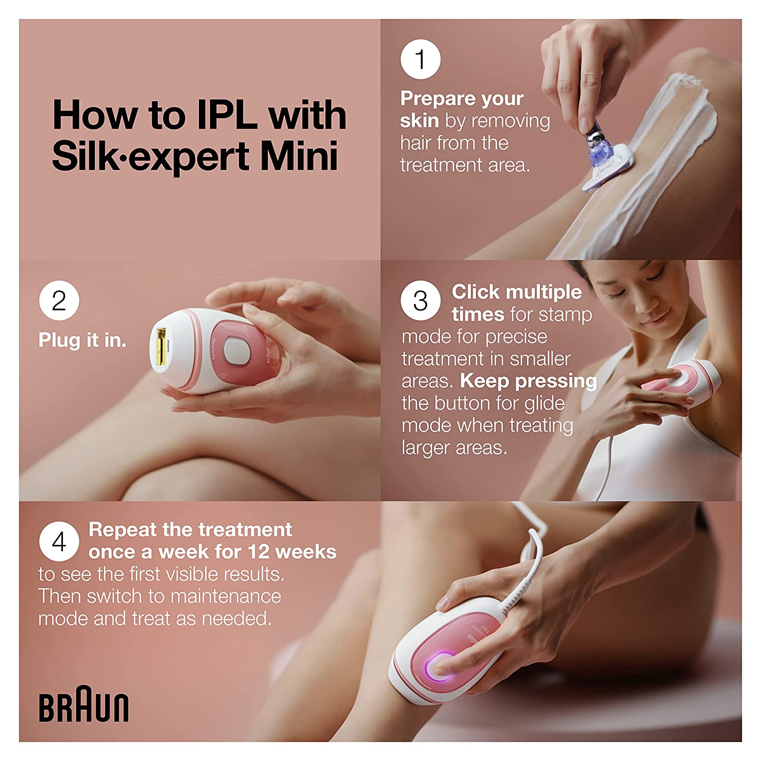 Silk·expert Mini is a safe, easy and efficient** IPL hair removal system for women. For visible hair reduction in just three months*. With SensoAdapt technology for safe use on skin: it automatically and continuously adapts to your skin tone to ensure optimal balance between efficacy and safety, for visible long-lasting hair removal from the comfort of your home. No complicated settings, easy to use. Compact design for easy handling. Travel pouch for on-the-go. *If used per the recommended regimen, individual results may vary **Efficiency based on the combination of window size, speed and energy. Safety technology shared with Cyden Box includes: 1x Silk·expert Mini 1x Pink travel pouch 1x Venus razor