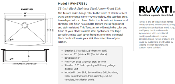 - Exterior DIMENSIONS: 33" (wide) x 22" (front-to-back), Interior bowl dimensions: 31" (wide) x 18" (front-to-back) x 9" (bowl-depth). MINIMUM BASE CABINET Size: 36". | Standard 3.5" drain opening will fit any garbage disposal unit (Note: matching garbage disposal flange [Model # RVA1041BL] sold separately)
