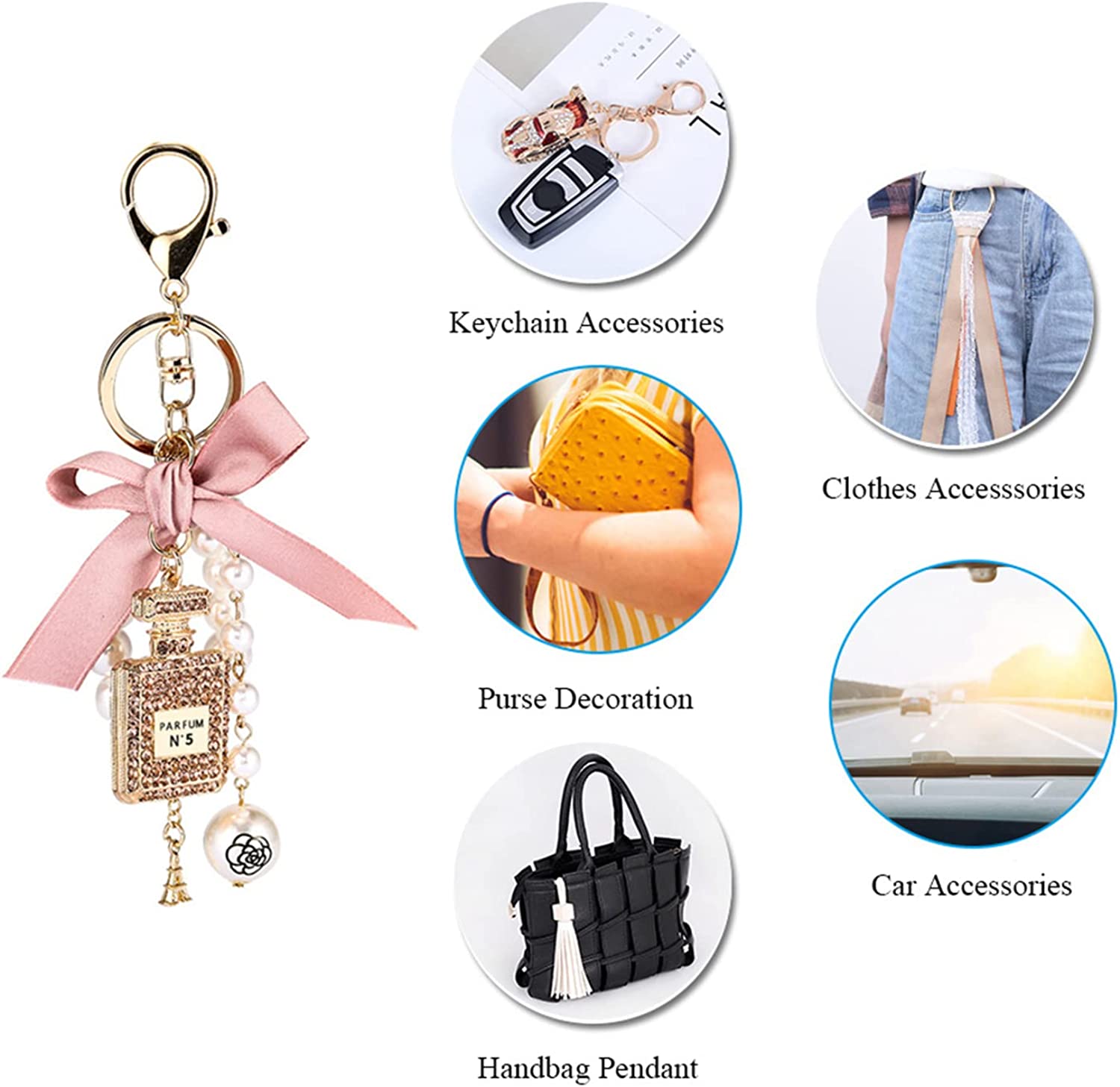FEATURES:Unique designed with PARFUM NO.5 perfume bottle with pearl strands and bowknot decor.Affordable price and beautiful looking, perfect decor for car, handbag, backpack, clothes, etc.Suitable for girls and women, giftable for your girlfriend, wife, mom, daughter, friends, etc.Ideal present for Birthday, Anniversary, Mother's Day, Christmas, Thanksgiving, and so on.