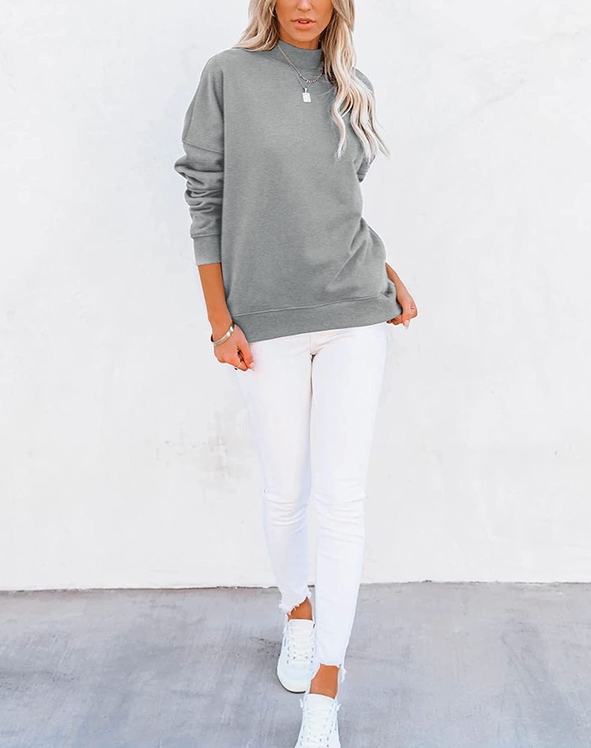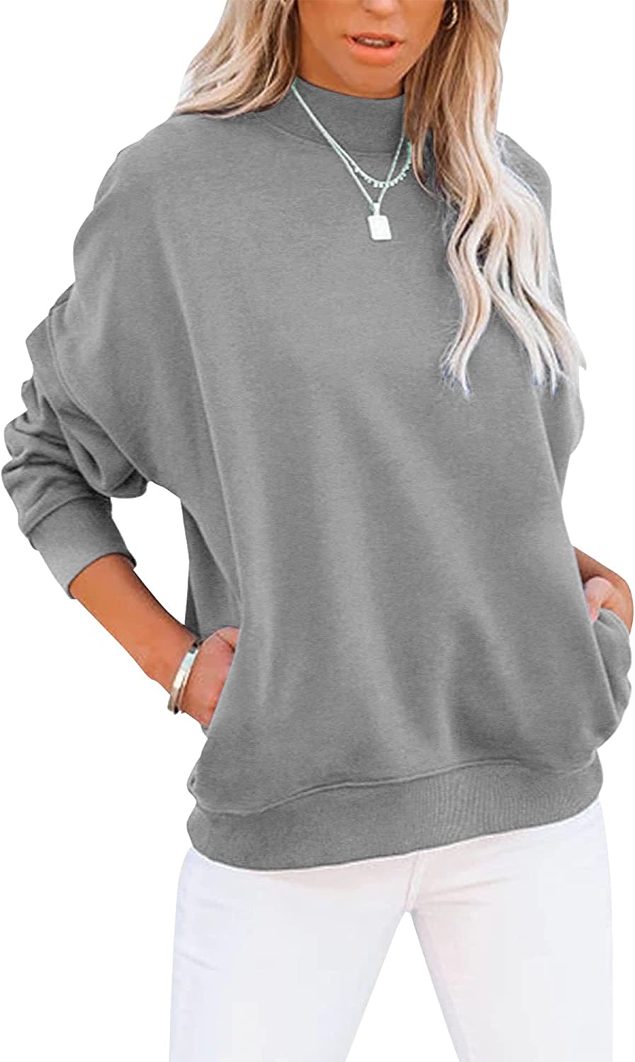 Features: Lightweight pocketed sweatshirt, basic solid color top, mock turtleneck, casual relaxed fit.