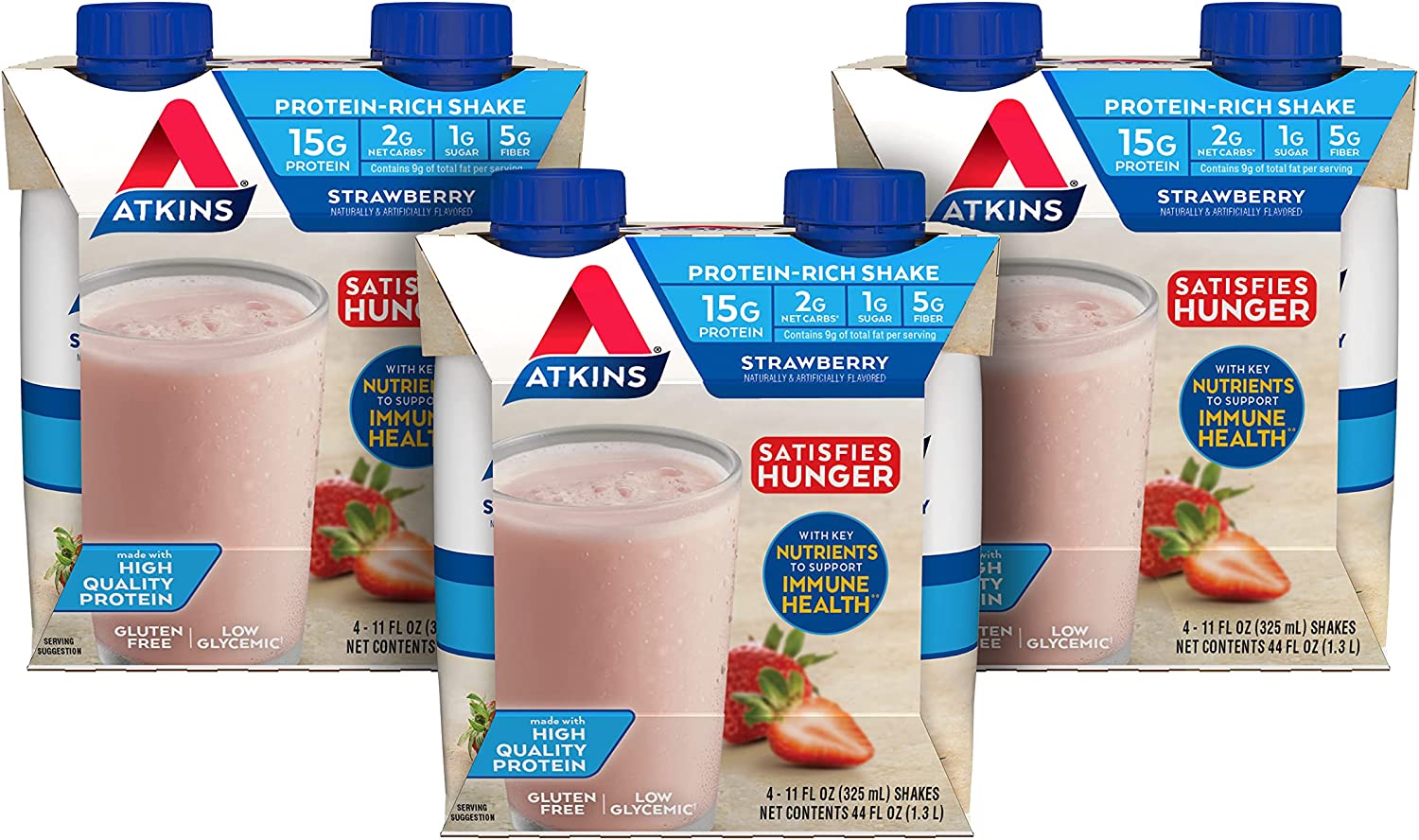 STRAWBERRY SHAKE. Enjoy this sweet and creamy shake as part of a balanced diet. Includes 3 packs of 4 ready-to-drink 11 oz shakes. Shelf stable - no need to refrigerate