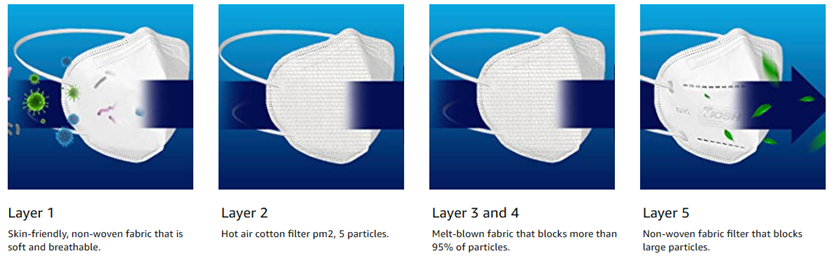 FIVE-LAYER DESIGN N95 filters with highly efficient filtering materials. Adjustable nose clip and ultrasonically welded headbands provide a tight and secure seal.