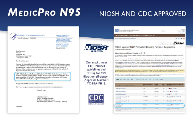 NIOSH APPROVED N95 mask meets CDC/NIOSH guidelines and testing for 95% particulate filtration efficiency - Approval Number TC-84A-PH16.
