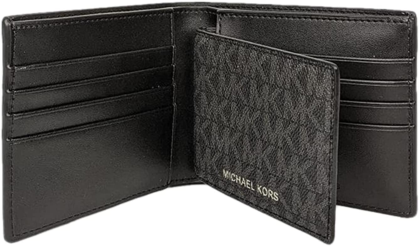 - Men's bifold wallet with subtle monogram print textured PVC coated canvas exterior