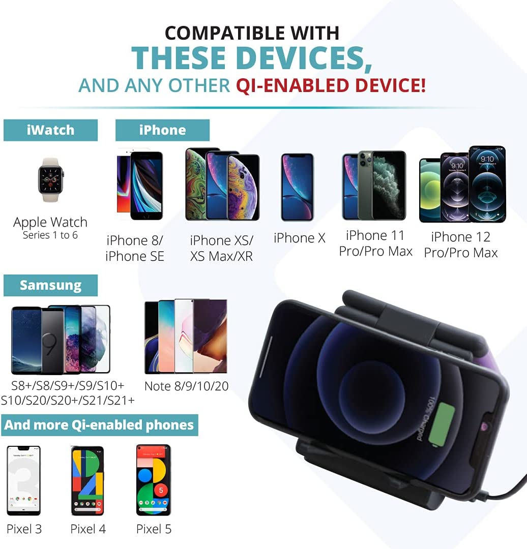• VERSATILE COMPATIBILITY: Compatible with all iPhone models, including iPhone 14, 14 Pro, 14 Pro Max, 13, 13 Pro, 13 Pro Max, 13 Mini, 12, 11, and older; Apple Watch Series 1-8, SE, and Ultra; AirPods and AirPods Pro wireless charging case; Google Pixel 5, Samsung Galaxy S21+, S21 Ultra, S21, Note 20, 10 Plus 5G, Note 10 Plus, Note 10, S10 5G, S10 Plus, S10, S10e, Note 9, S9, and S9+; All other Qi wireless-enabled devices