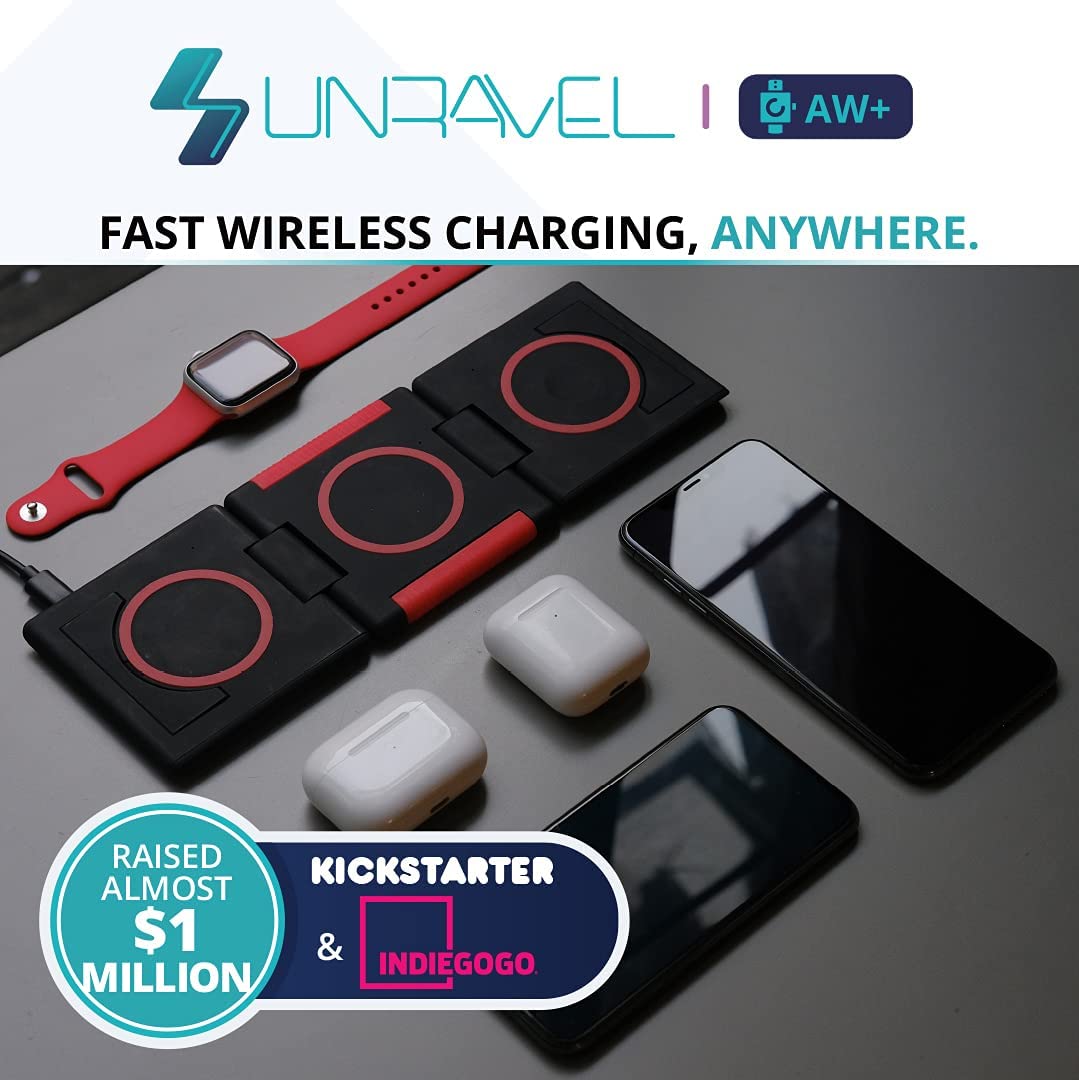 • FOLDABLE TRAVEL-FRIENDLY DESIGN: Patented design folds neatly into a 1" wallet-sized stack for a space-saving single-device charger, use triangle-mode to charge while you Face Time or lay it flat to charge 3 devices at once using its omni charging pads