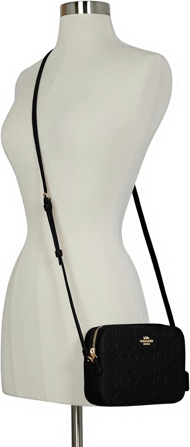 Signature perforated leather Two credit card slots Inside multifunction pocket Zip closure, fabric lining Outside open pocket Adjustable strap with 23" drop for shoulder or crossbody wear 7 1/4" (L) x 5 1/4" (H) x 2" (H)