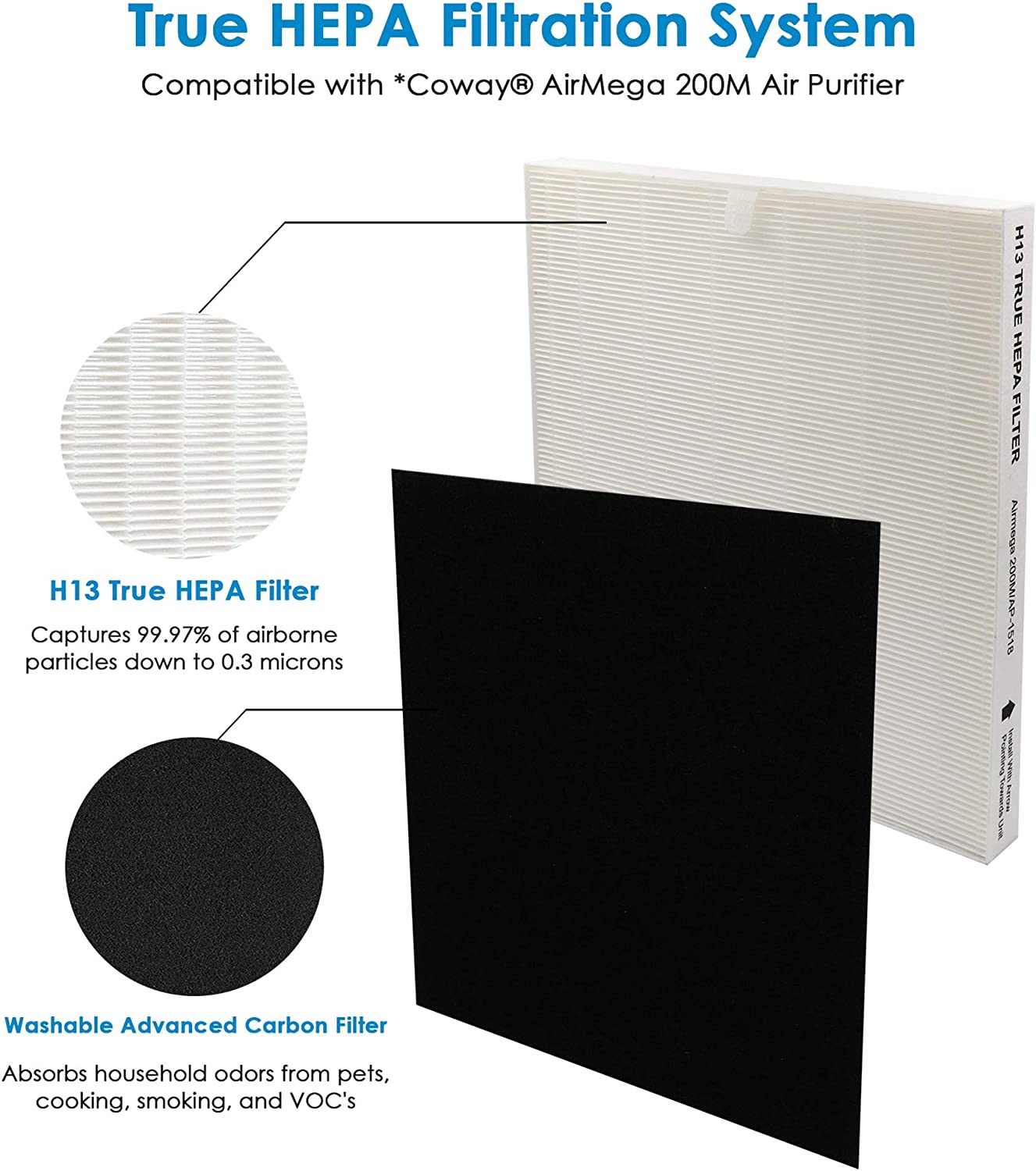 Flintar premium high-efficiency H13 True HEPA Replacement Filter Set is a complete one-year filter pack and fully compatible with *Coway AP-1512HH Mighty and Airmega 200M Air Purifier. This True HEPA Filtration system contains the following filters: