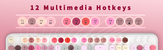 • 【104 Key FULL-SIZE KEYBOARD】13 Easy-to-reach function keys provides a shortcut to your music,emails,multimedia control,web,etc.For instance,you can play the music you want by simply press the Fn+Esc. This Is a Full-Size Keyboard. All 104 Keys Non-Conflict.