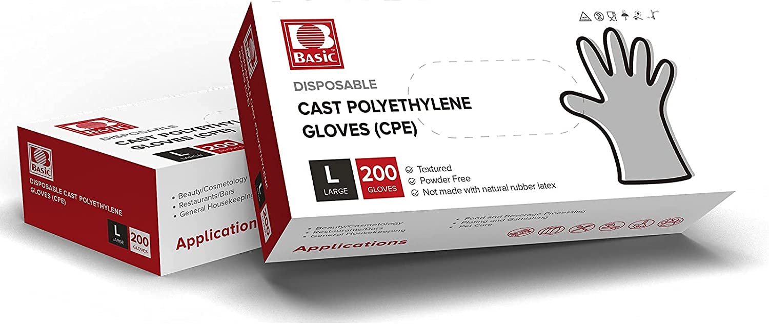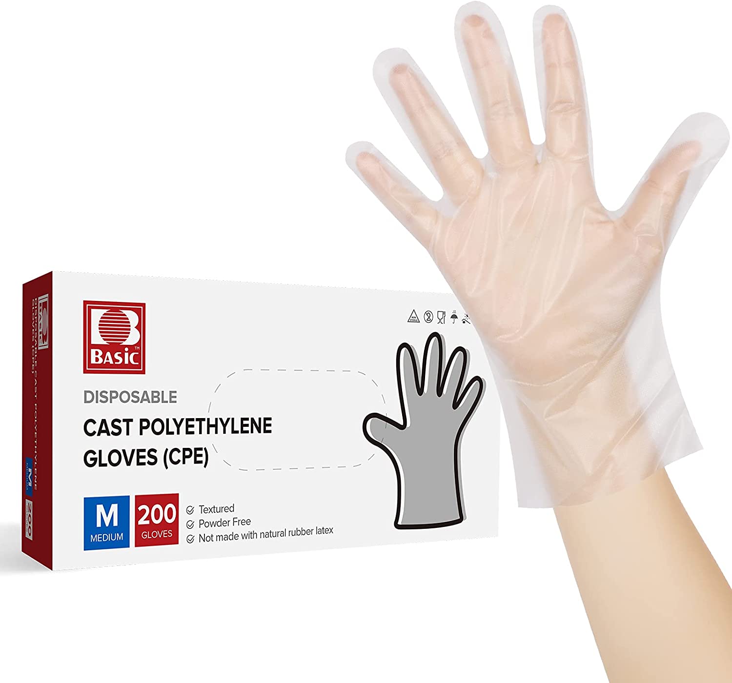 Basic 1 Box 200Pcs Disposable Cast Polyethylene Gloves Textured Powder Free Latex Free Non Sterile (Large)