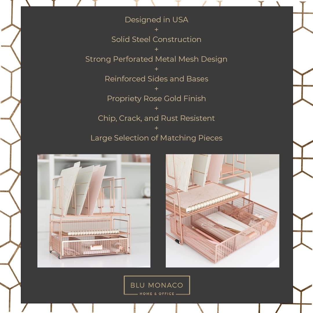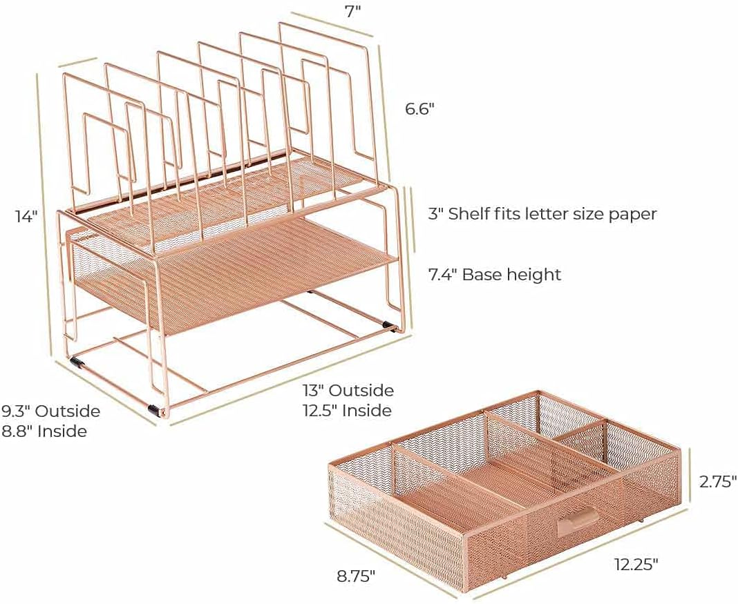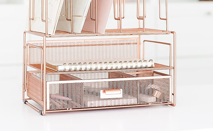 - MODERN, SPACE SAVING DESIGN: Organization does not have to be difficult. Made of metal finished in rose gold and featuring a unique mesh design, this Vertical and Horizontal File and supplies organizer with drawer and letter sorter keeps things organized and saves space.