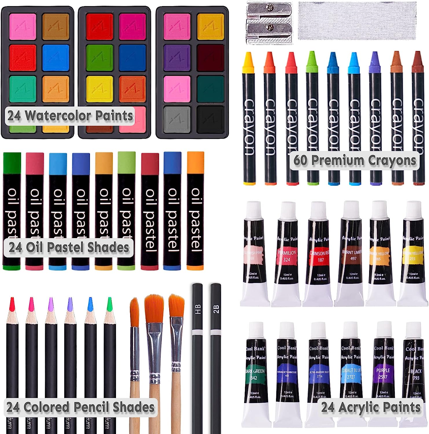 ✅THE ESSENTIALS: This art set contains a remarkable 175 pieces-60 crayons, 24 acrylic paints,24 oil pastels, 24 color pencils, 24 watercolor cakes, 8 brushes, 3x8-well palettes, 2 drawing pencils, 1 sharpener, 1 sandpaper block, 1 art eraser ,1 x 50 Page Drawing Pad,1 x 24 Page Acrylic Pad+1 wooden case.