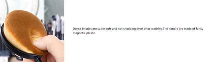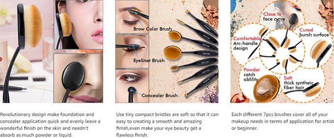 2、Oval Brush: Cheek Contour、Foundation、Setting Powder、Eye shadow colour、Concealer