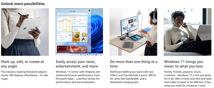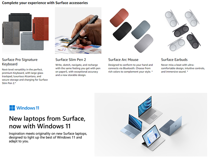 *Some accessories and software sold separately. Available colors and materials may vary by market and configuration. 1 - Battery life varies significantly based on usage, network and feature configuration, signal strength, settings and other factors. See Surface.com for details. 2 - Requires Dolby encoded content and audio. 3 - Pen storage and charging available on select Keyboards. 4 - Tactile signals with Surface Slim Pen 2 can be experienced on some applications on Surface Delia running Windows 11. Surface Slim Pen 2 sold separately.