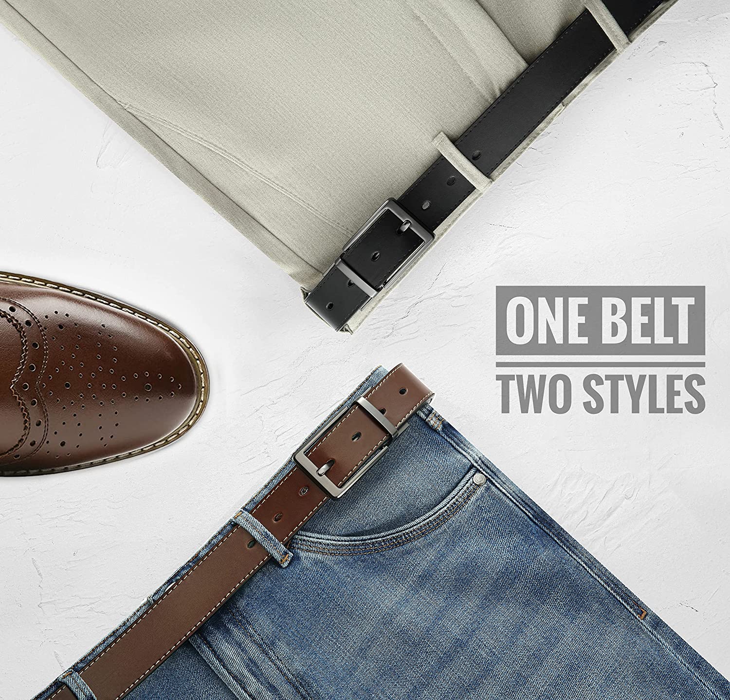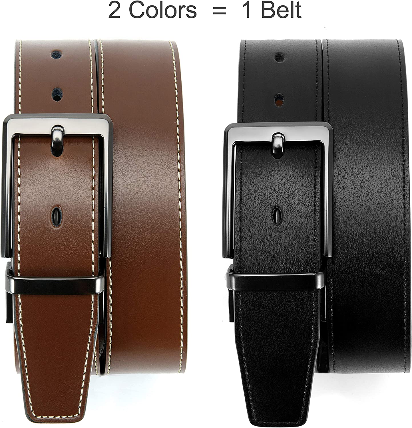 • 2-IN-1 VERSATILE STYLE - Pay for one but get two colors in one leather belt. The Classic design of the men’s belt is perfect to be paired with your favorite jeans, casual or dress pants. PERFECT FIT - Changing the design of the traditional double side, No-More-Screwdriver-Tools, you can easily trim to your exact size, especially for you with 33/35 waist.