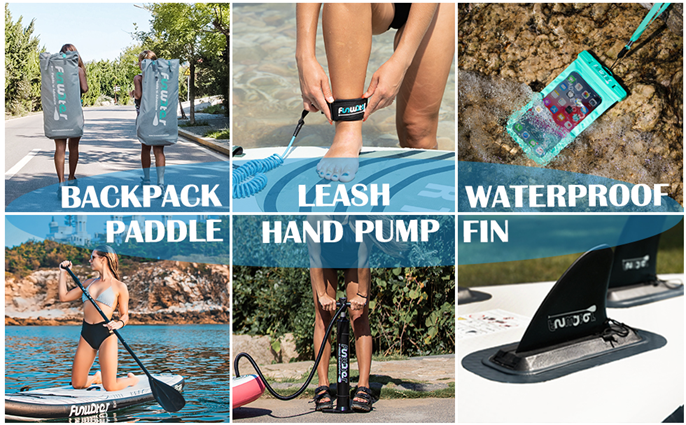 • The above accessories will be included in the package you receive:Adjustable aluminum paddle, high pressure pump, travel backpack, coil leash,waterproof bag, and 3 removable fins.