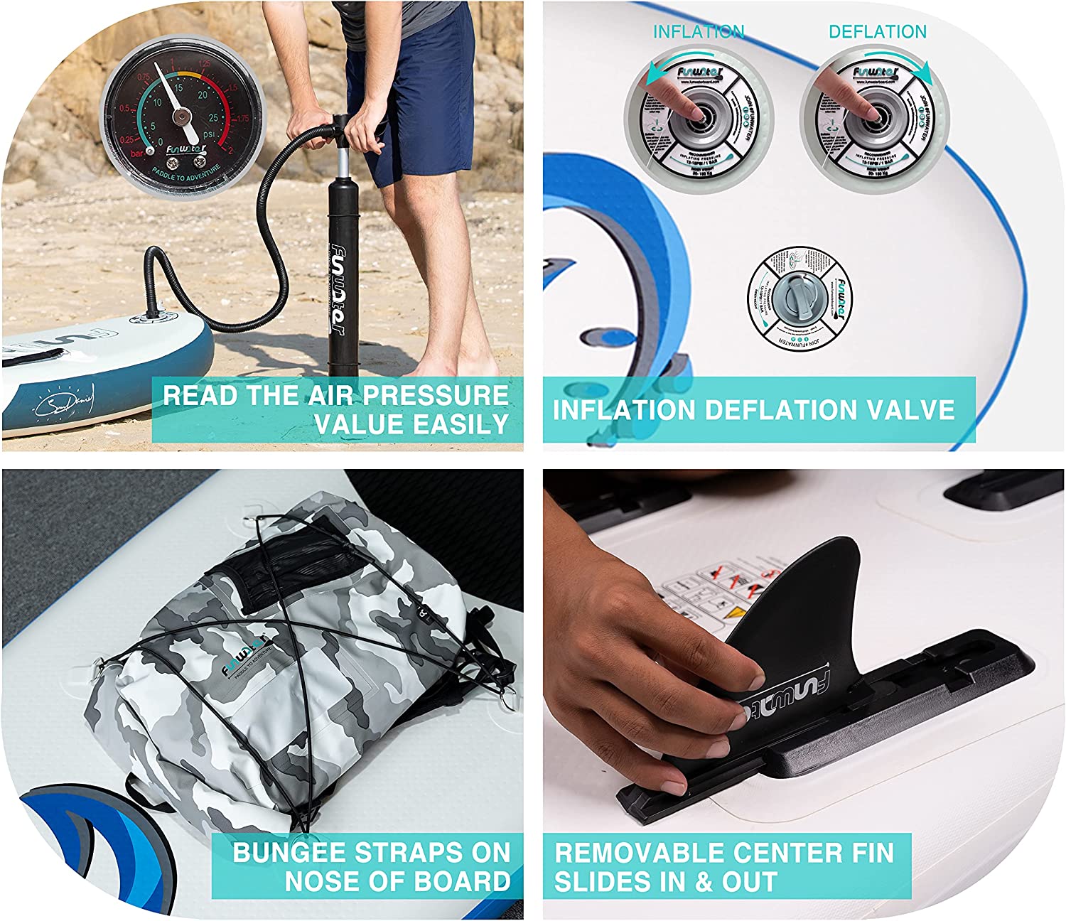 • 【Design and Use】Funwater's unique ergonomic handle design allows you to inflate your paddle more easily in a shorter time. The sensitive barometer ensures that you can read the sup inflation pressure value (12-15psi) at any time. The multifunctional elastic string can tightly fix any objects placed on the inflatable paddleboard. The multipurpose and ultra-large backpack can help you easily carry the paddle to any of your dream places.