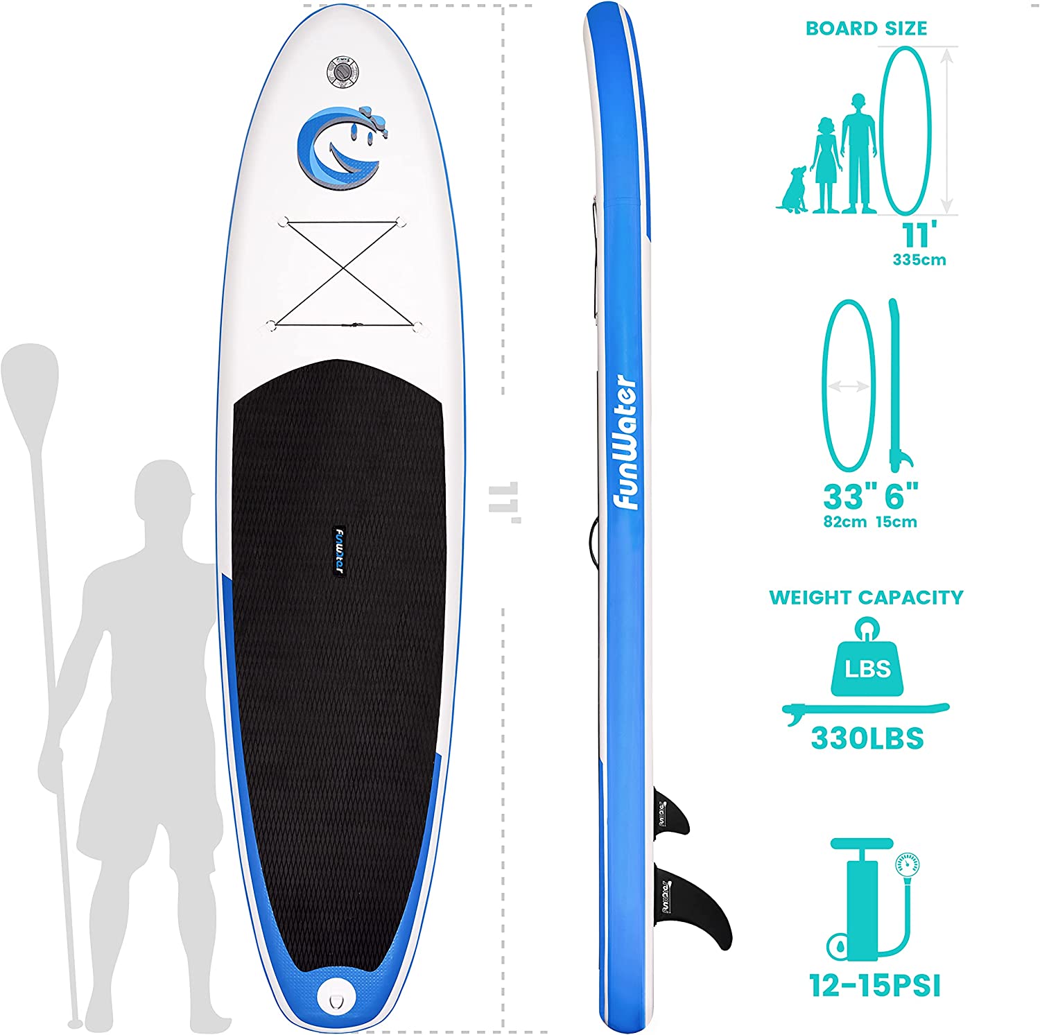 FunWater Stand Up Paddle Board 11'x33''x6'' Ultra-Light (20.4lbs) Inflatable Paddleboard with ISUP Accessories,Three Fins ,Adjustable Paddle, Pump,Backpack, Leash, Waterproof Phone Bag