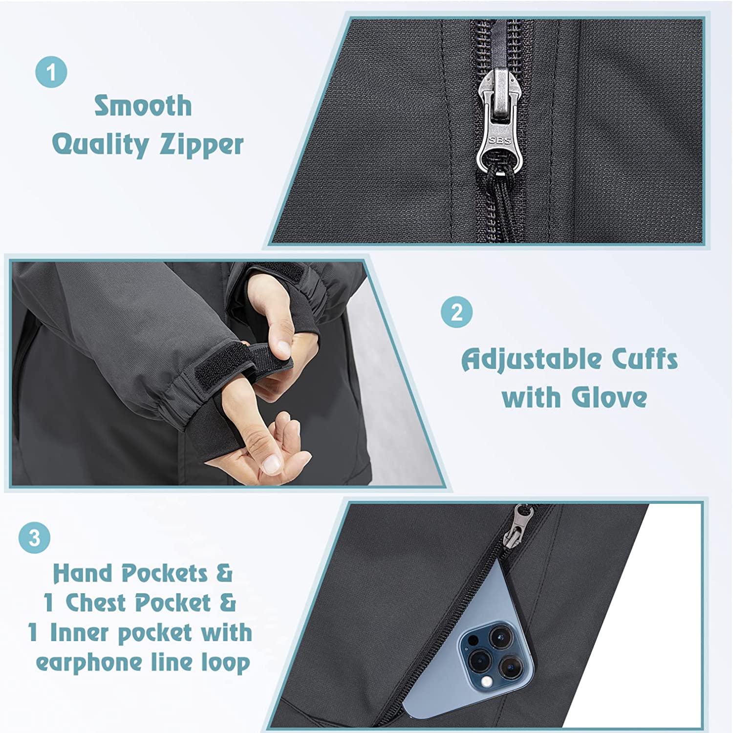 • Windproof Raincoats: (1) Adjustable cuffs and stretchable glove with thumb hole, well-built stiching fuzzy collar to seal in warmth. (2) Removable fleece hood to make the best heat retention in cold days. (3) Stand collar, a full zipper with button placket helps lock temperature.