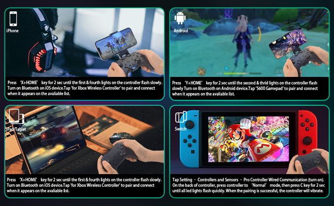 ?【Connect And Play】Don't need keymapping. Connect and play. Turn on Bluetooth on iOS device.Tap 'for Xbox Wireless Controller' to pair and connect when it appears on the avaliable list. Turn on Bluetooth on Android device.Tap 'S600 Gamepad' to pair and connect when it appears on the avaliable list. Gamepad no lag time or latency, pressure sensitive buttons offer precise control and accurate response, perfect real action play with real games and strong feeling.