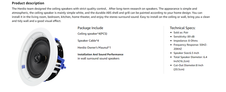 • 【Package Include & Service】Ceiling Speaker*4,Speaker Cable*2,Herdio Owner's Maunul*1 In The Box.All the home speakers have passed strictly quality control before we delivery for you,Herdio store provide one year warranty and premium customers service within 24 hours .If you have any question that you can email us in the first time,and we will pleasure to help.