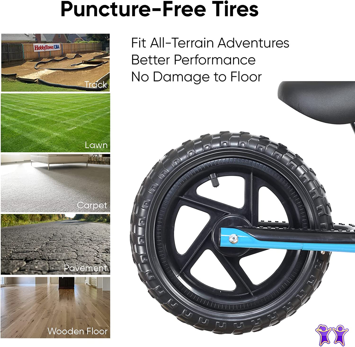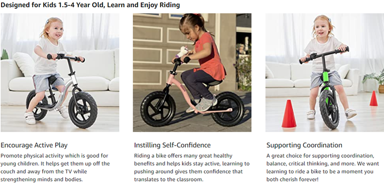 - EXTRA-THICK ALL-TERRAIN TIRES – We want kids to feel strong and stable when they’re moving on grass and sidewalks which is why we added puncture-resistant tires to the front and back of each balance bike for 4-year old’s and 18-month-old riders.