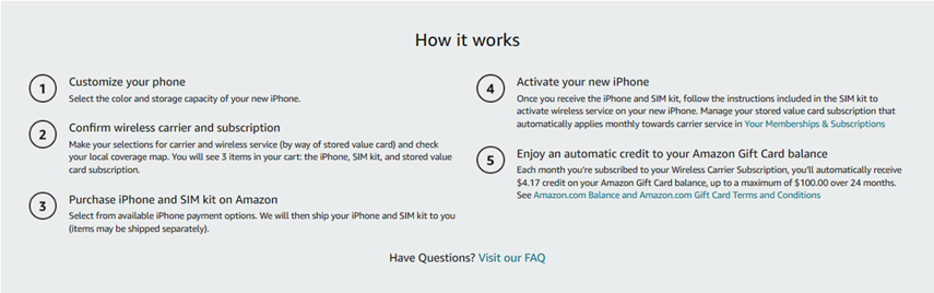 1. What is a stored value card and how do I redeem this? How do I pay for this monthly stored value card subscription?A stored value card is what Amazon uses to transmit your monthly service payment to the wireless carrier you select to apply towards cellphone service for your selected plan. We, Amazon, will charge your preferred payment method the same amount each month for the stored value card subscription which will be automatically applied by your carrier to your wireless account to pre-pay the next month’s cellphone service charges. You do not need to do anything. The stored value card subscription will automatically renew monthly until cancelled.