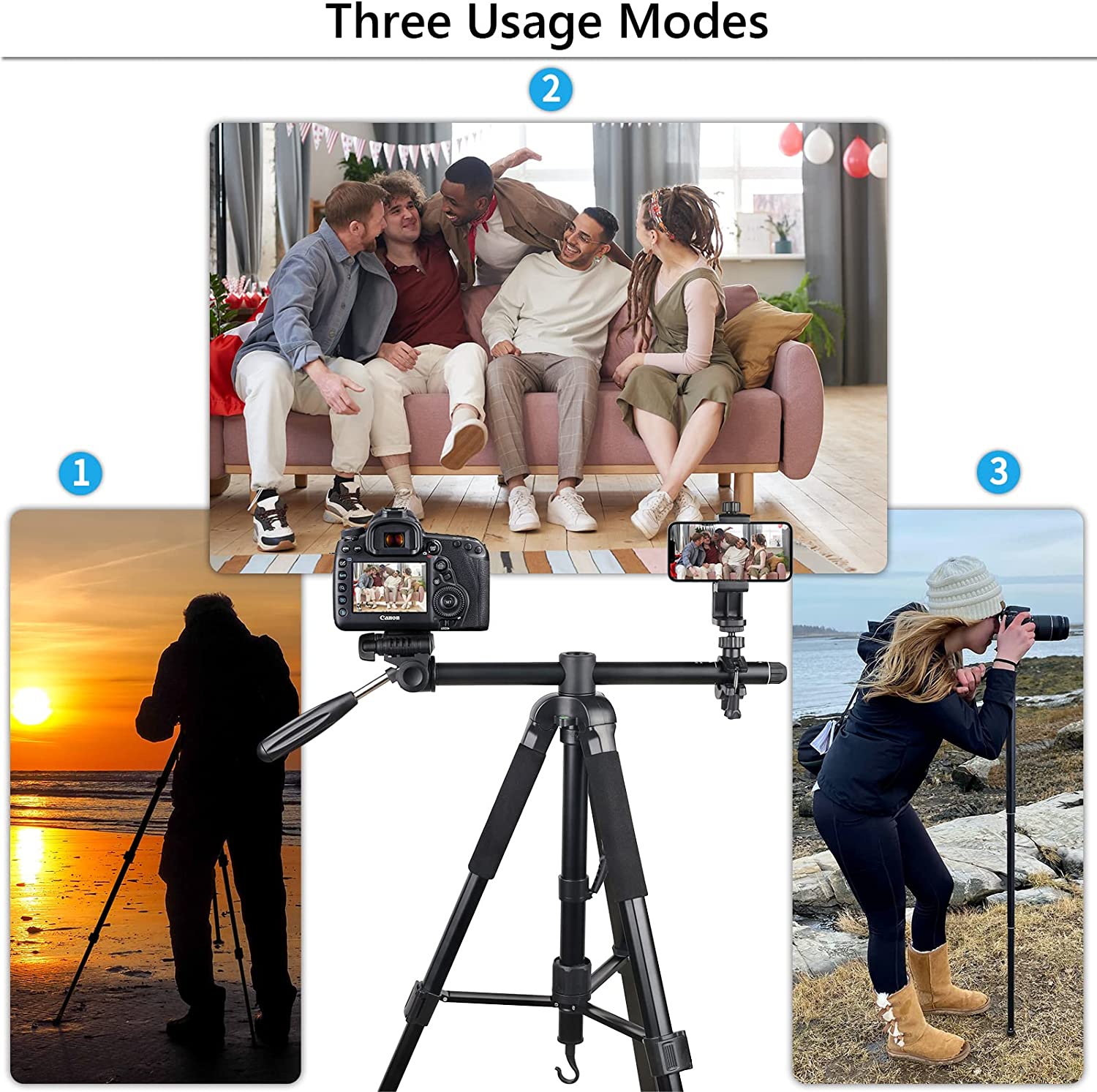 【Newly Upgraded 3-IN-1 Tripod】ZF20 tripod is the latest design upgraded from the classic aluminum portable tripod. This gives him more features, more satisfying height of use and stability. ZF20 tripod can meet the functions of monopod, horizontal tripod, double base tripod, to meet more shooting needs and uses.