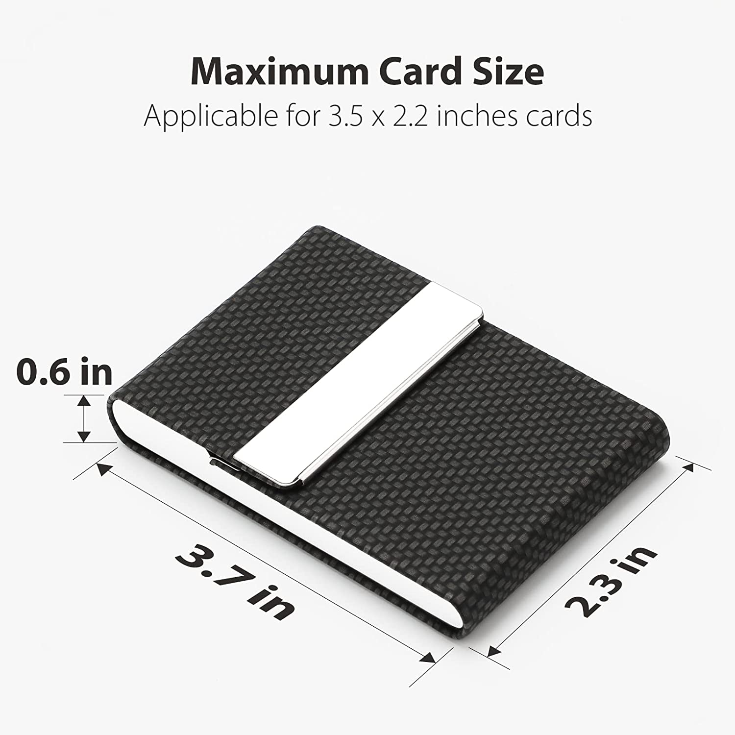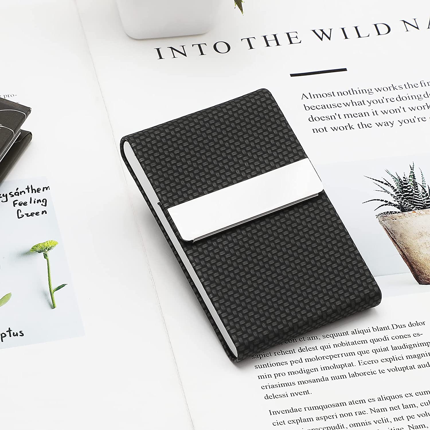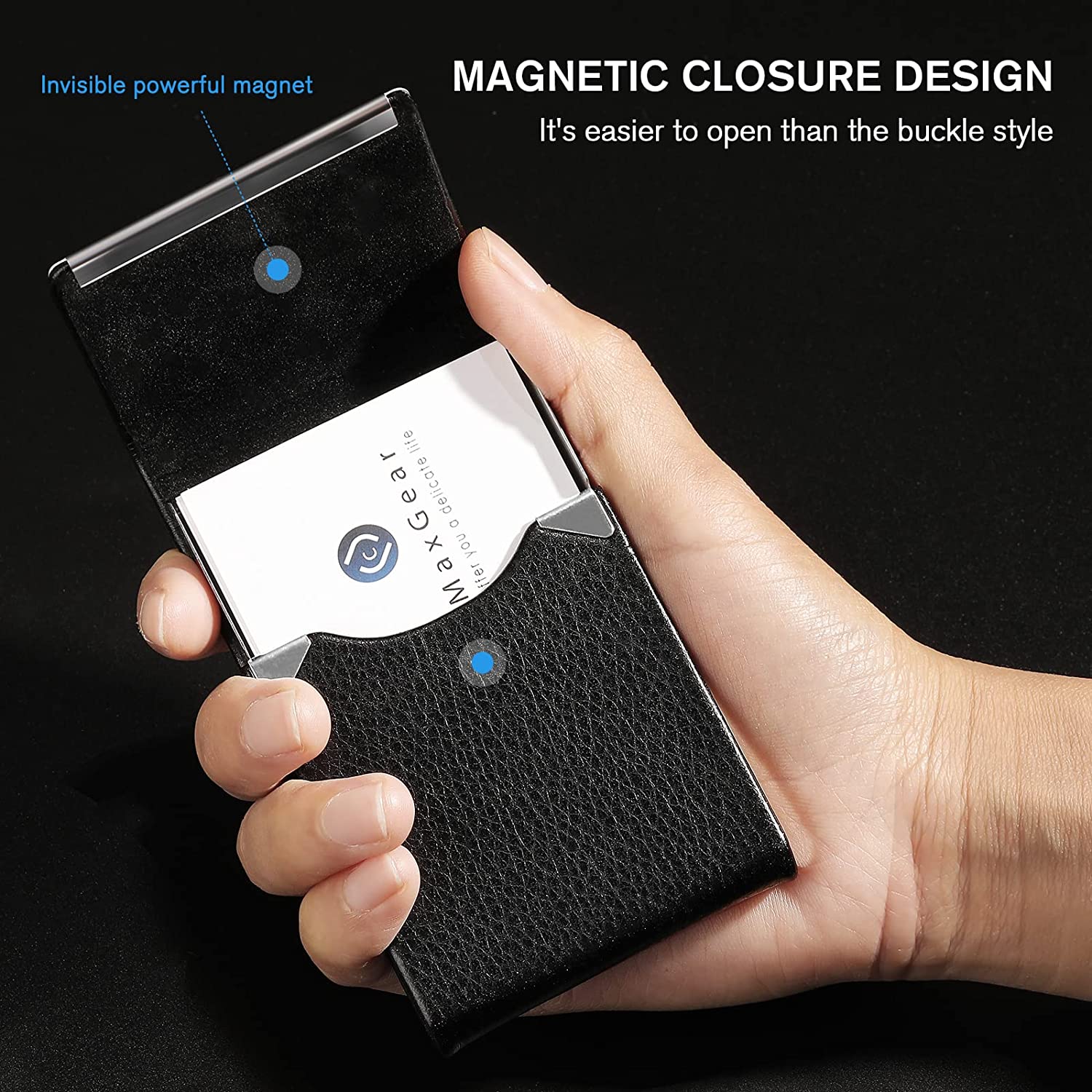 MaxGear Business Card Holder, PU Leather Business Card Case Pocket Card Holders for Men or Women, Metal Slim Name Card Holder RFID Blocking Business Card Carrier with Magnetic Closure, Black Carbon