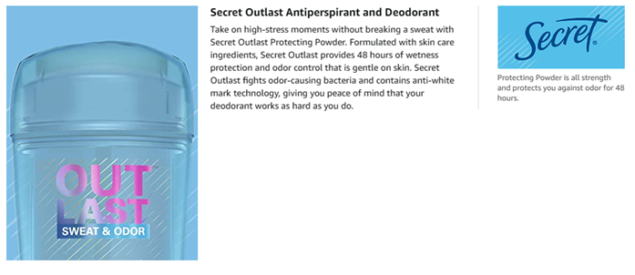 • Don't waste a moment worrying about sweat. Secret Outlast Antiperspirant Deodorant is all strength, no sweat