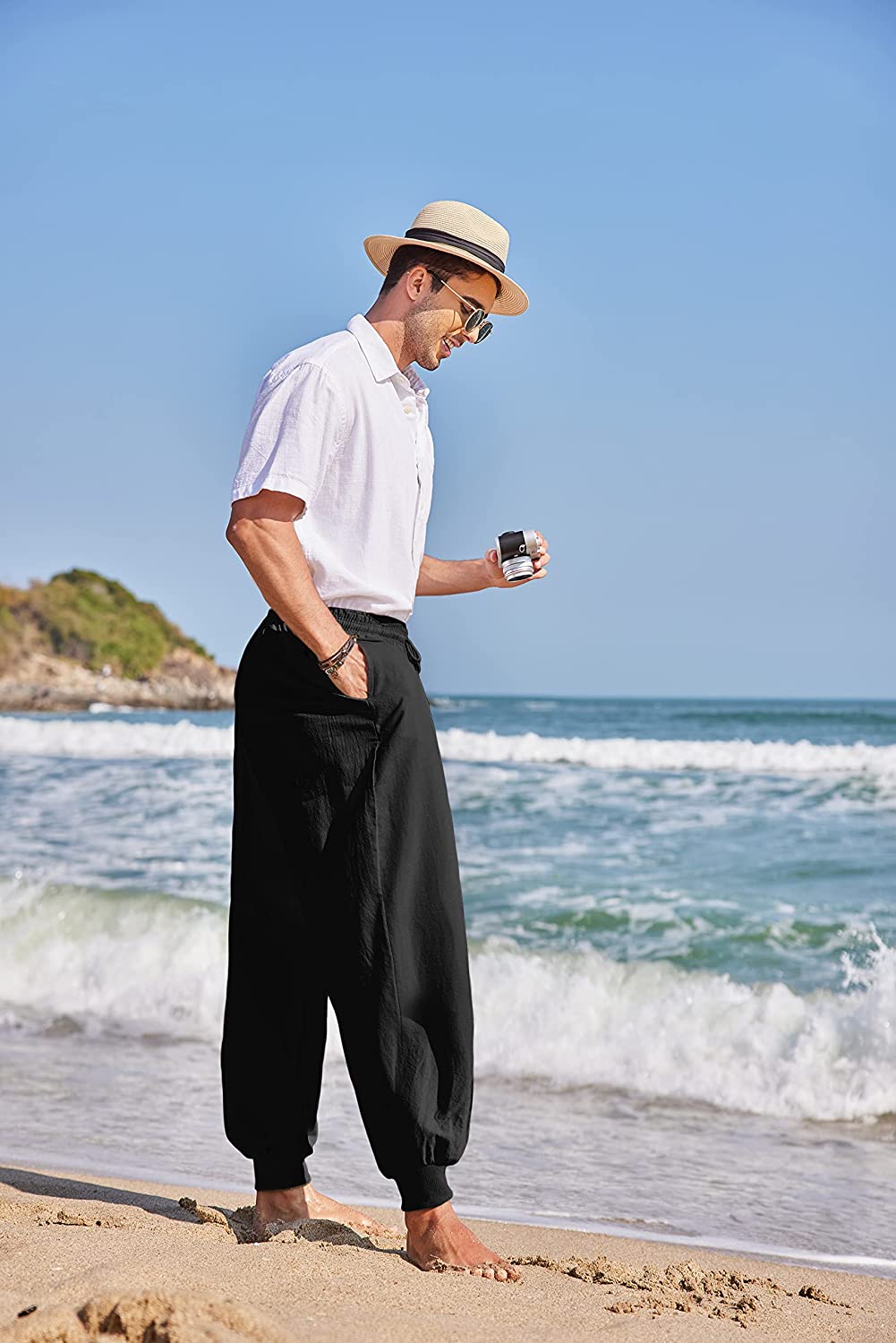 COOFANDY Men's Hippie Pants Linen Yoga Trouser Summer Casual Stretched Waist Loose Fit Beach Pants