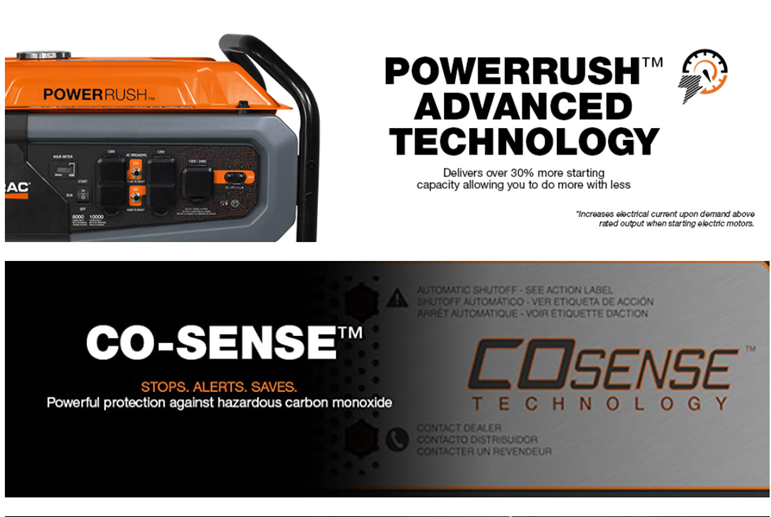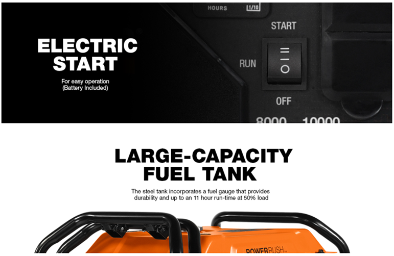 Generac’s GP8000E offers many benefits that make this model a favorite for emergency power or recreational use. Power Rush Advanced technology delivers over 30% more starting capacity* (*increase electrical current upon demand above rated output when starting electric motors), and electric start makes the GP8000E easy to use (battery included). You’ll always be prepared with the plug-in battery jack that keeps the battery charged and ready for unexpected outages. The long-lasting OHV engine and large-capacity steel fuel tank with fuel gauge provide increased durability and up to an 11-hour runtime at 50% load. Rough or rugged environments will not be an issue thanks to the covered outlets for added protection, heavy-duty wheels that will never go flat and a fold-down handle that will enable you to easily transport your generator to any location. The low-oil feature will automatically shut down the generator, preventing damage to the unit, while the hardened 1. 25-in. Steel-tube cradle increases strength and resilience. And with the regular maintenance alerts provided by your hour meter, you’ll never be caught off guard.