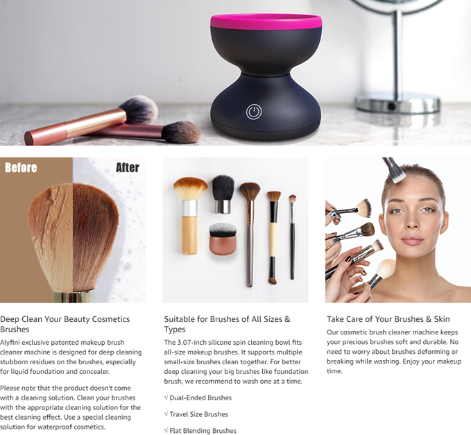 Are you still washing the cosmetic brushes by hand? Are you still struggling with old machines and bothered by complex operations? Stop concerning your beauty makeup brushes set were broken or rubbed by mismatched tools. Alyfini ELECTRIC MAKEUP BRUSH CLEANER MACHINE is here to take care of your precious makeup brushes from damage. Deep clean your brushes with simple operation and bring you a better makeup experience.